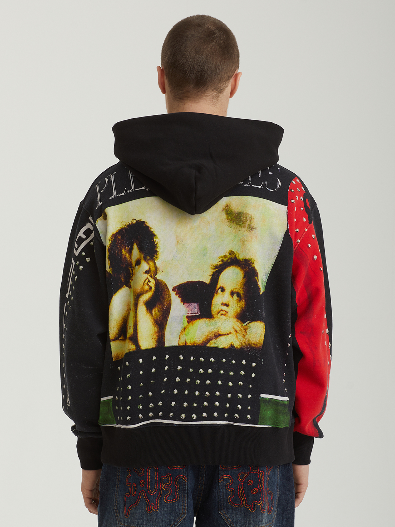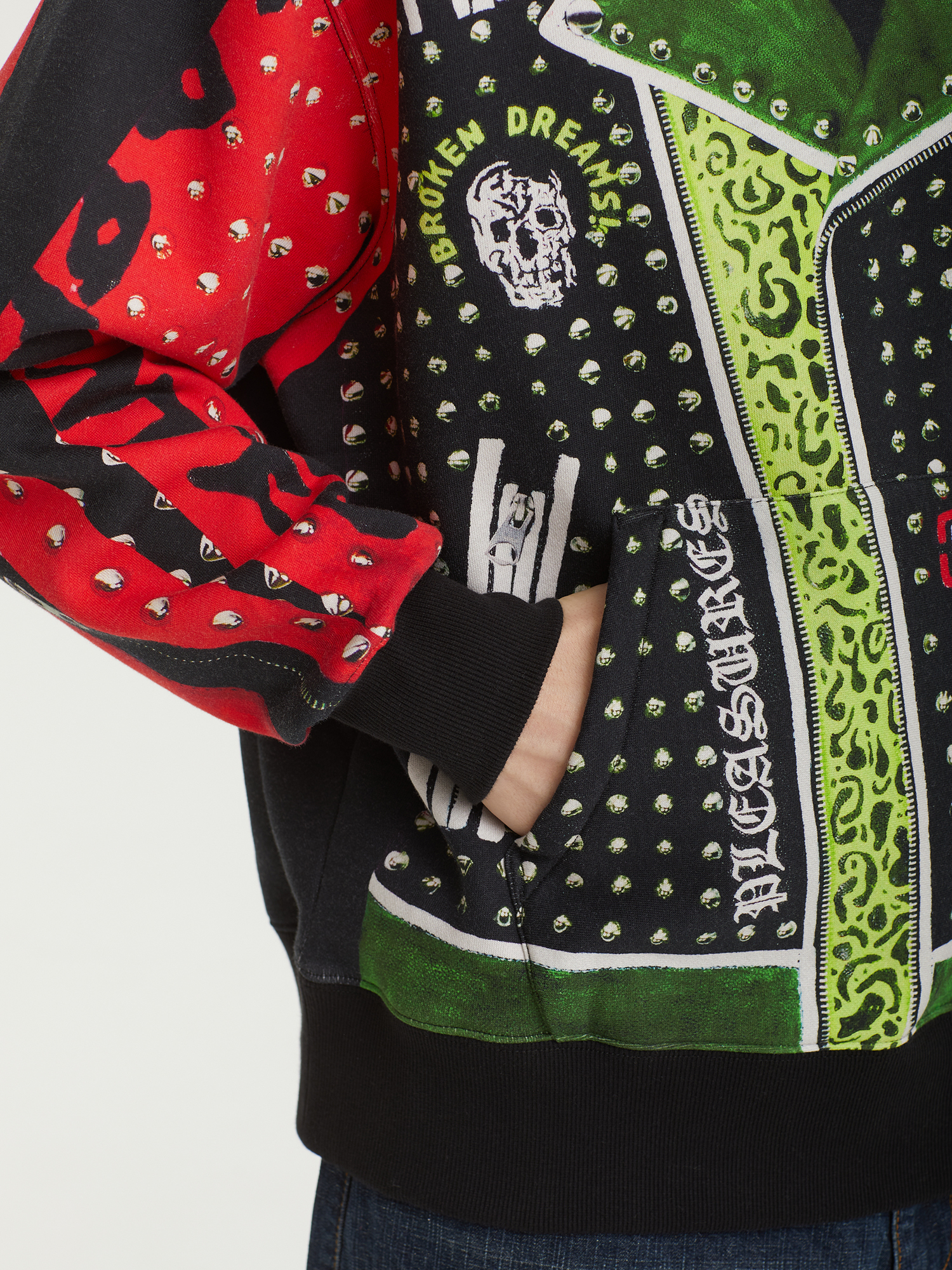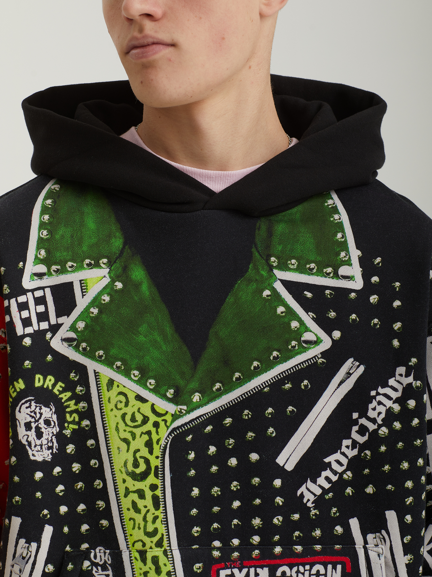 Классическая кожаная куртка, напечатанная на худи. Полноформатный графический принт в характерной эстетике Pleasures. Модель выполнена из плотного смесового трикотажа в свободном крое. Оснащена объемным карманом-кенгуру, эластичными манжетами и нижней резинкой в рубчик для удобной посадки.