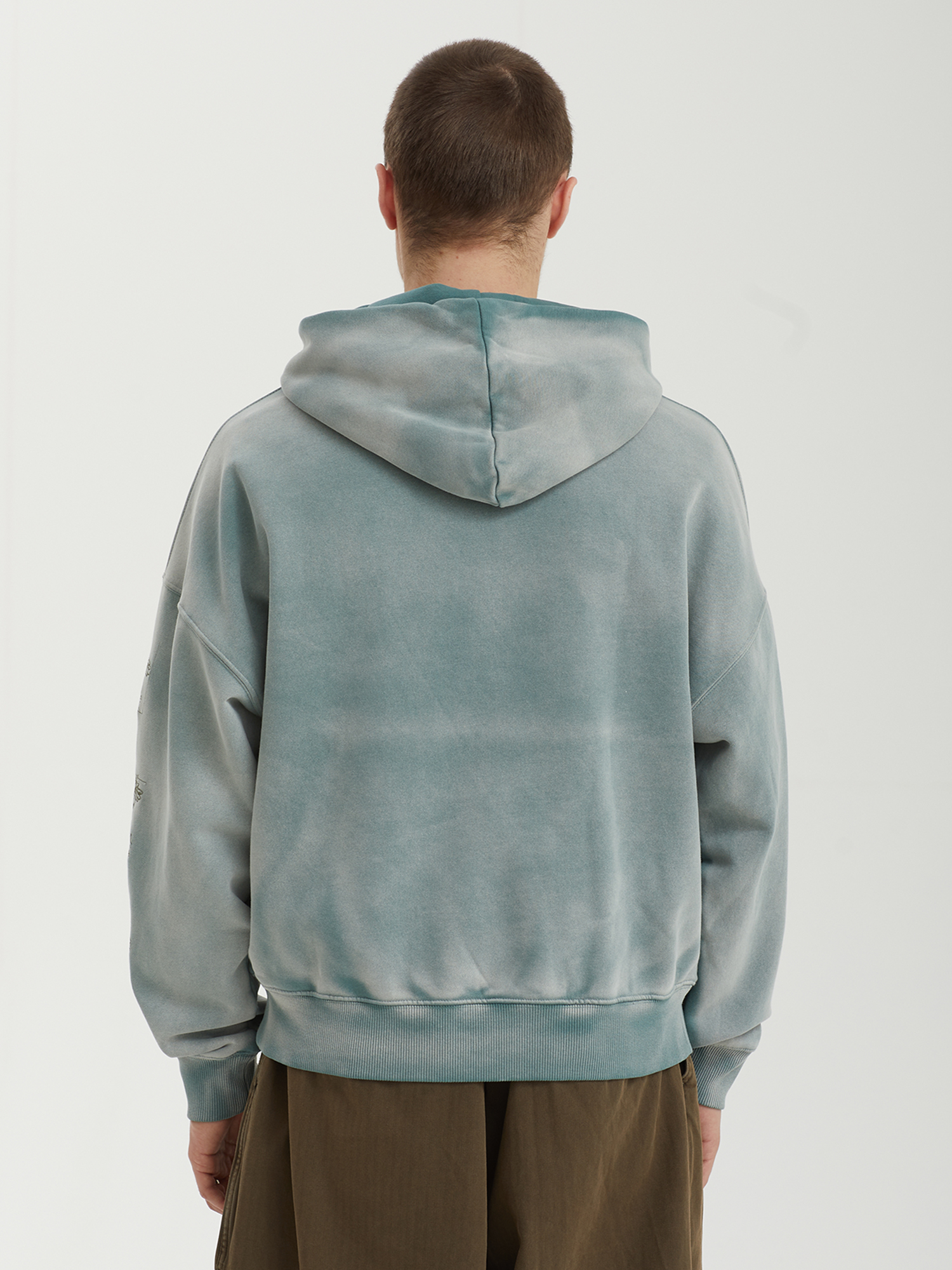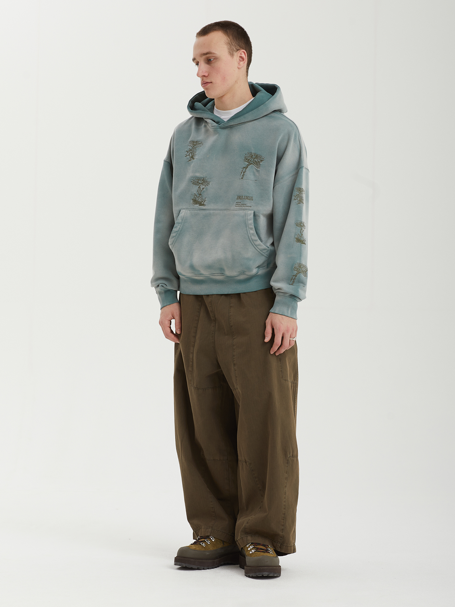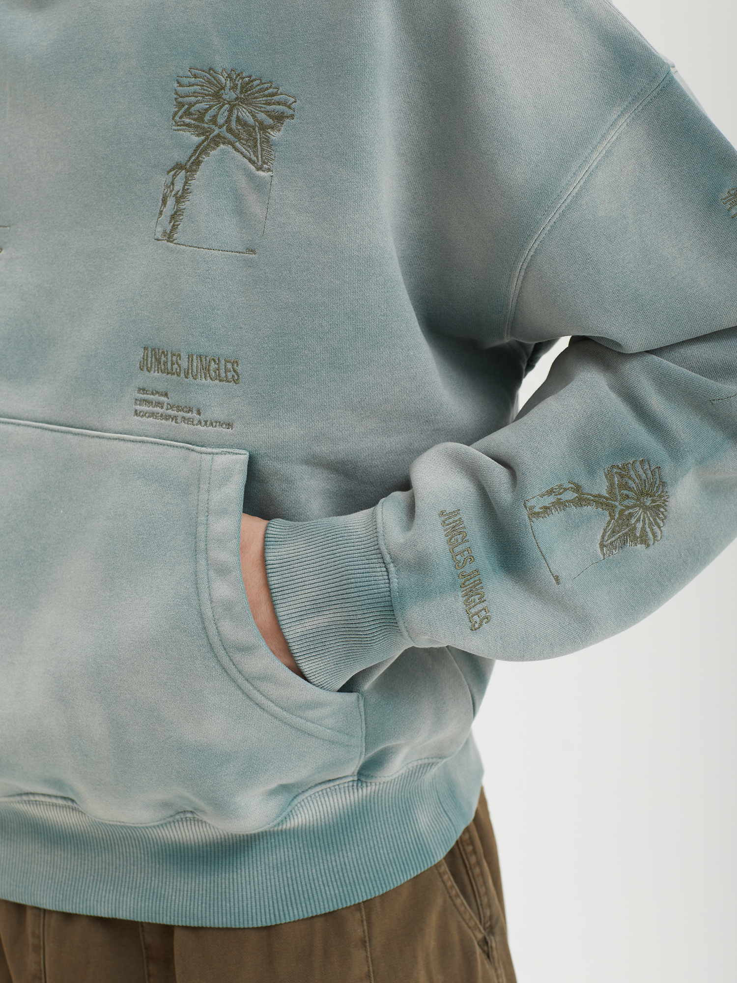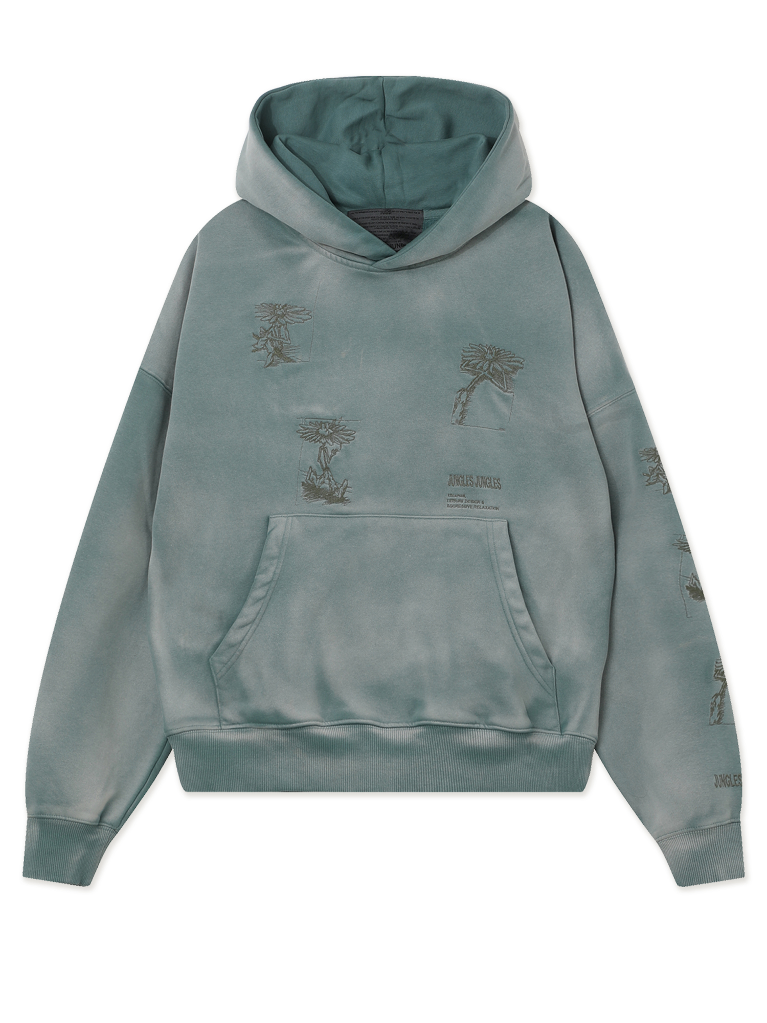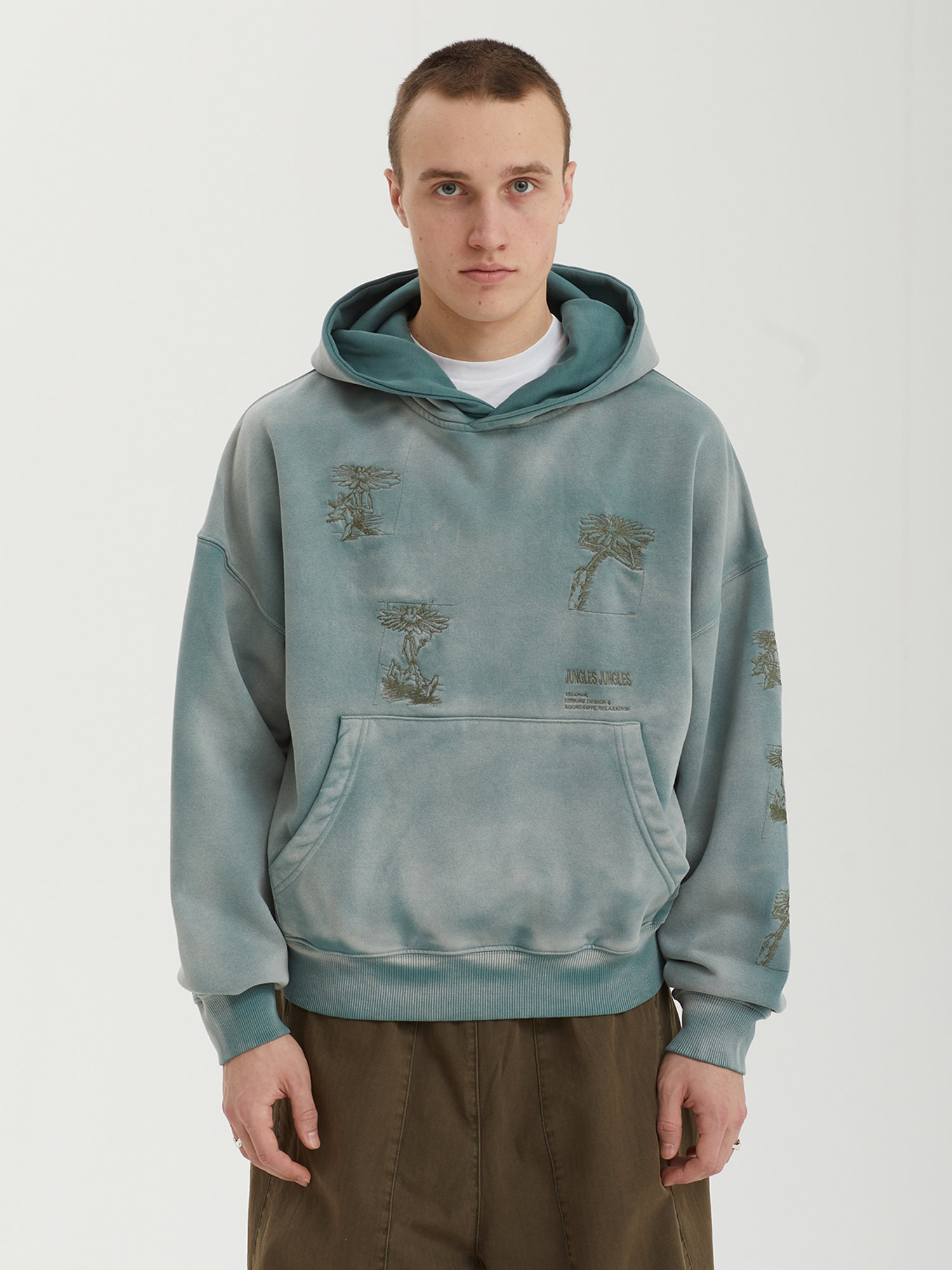 Худи Jungles Jungles из плотной ткани с ворсистой изнанкой. Изделие выстирано для получения винтажного эффекта и дополнено небольшими вышивками. Бренд прошел сертификацию BSCI — инициативы по соблюдению социальных норм бизнеса.