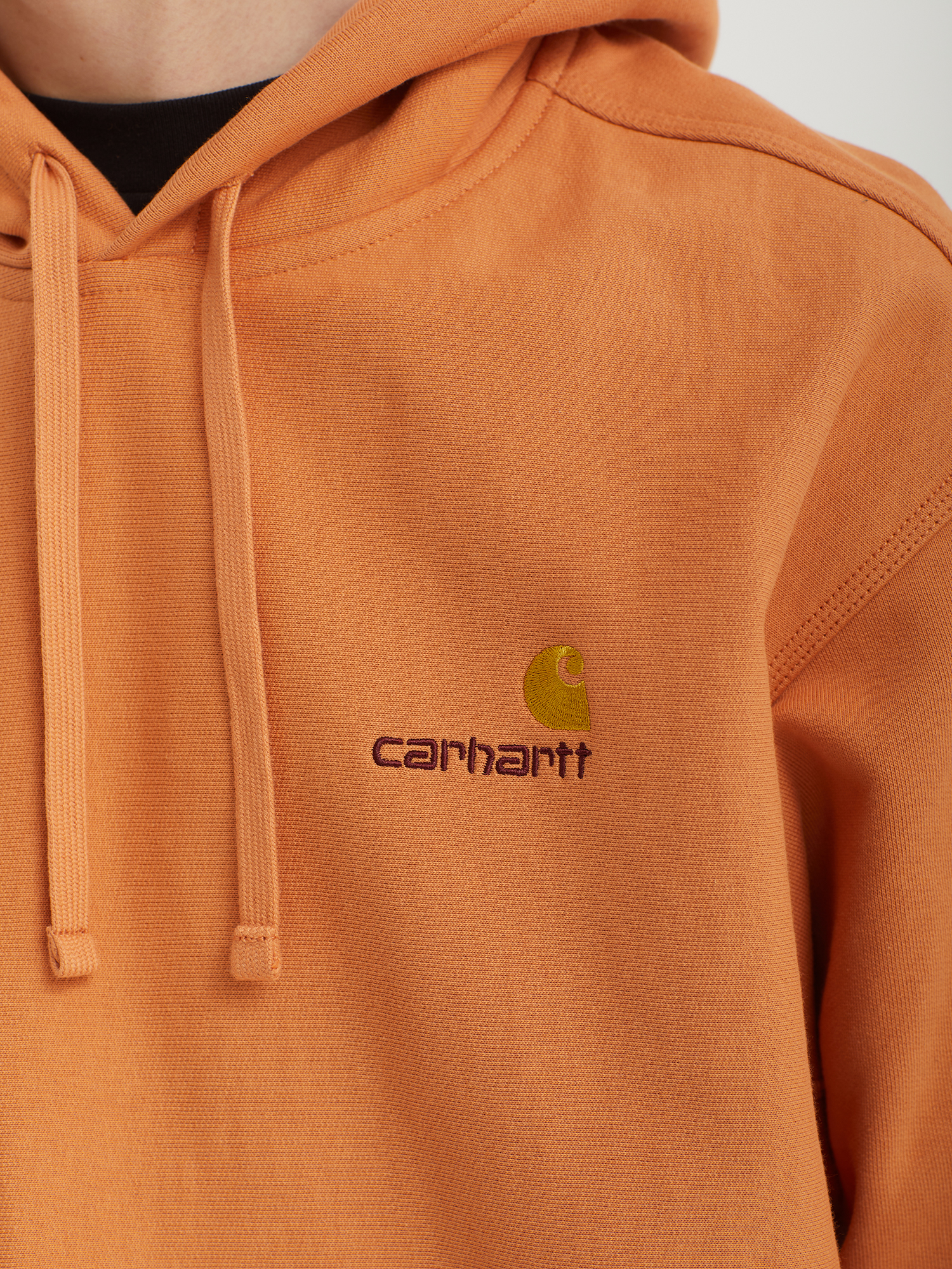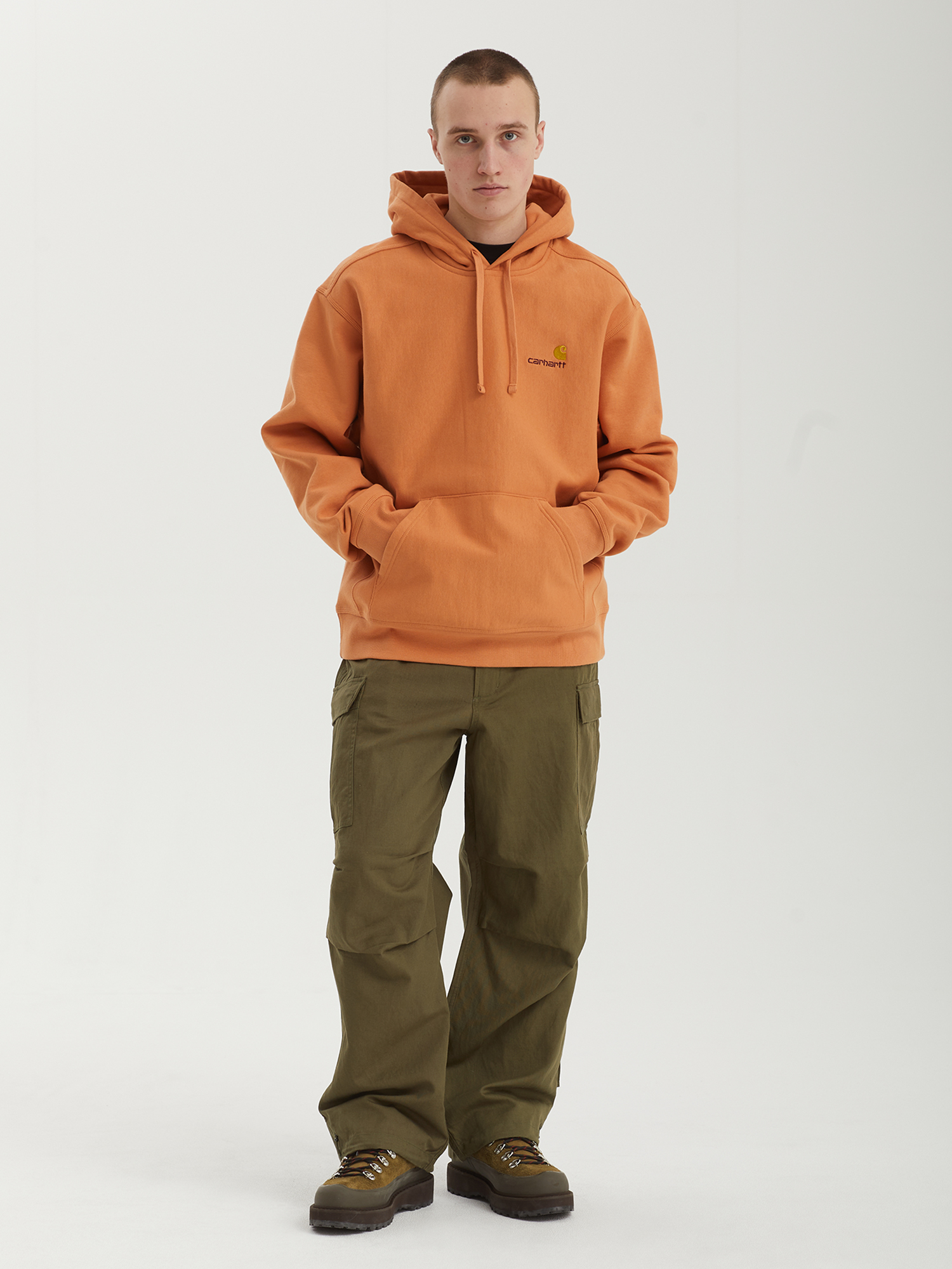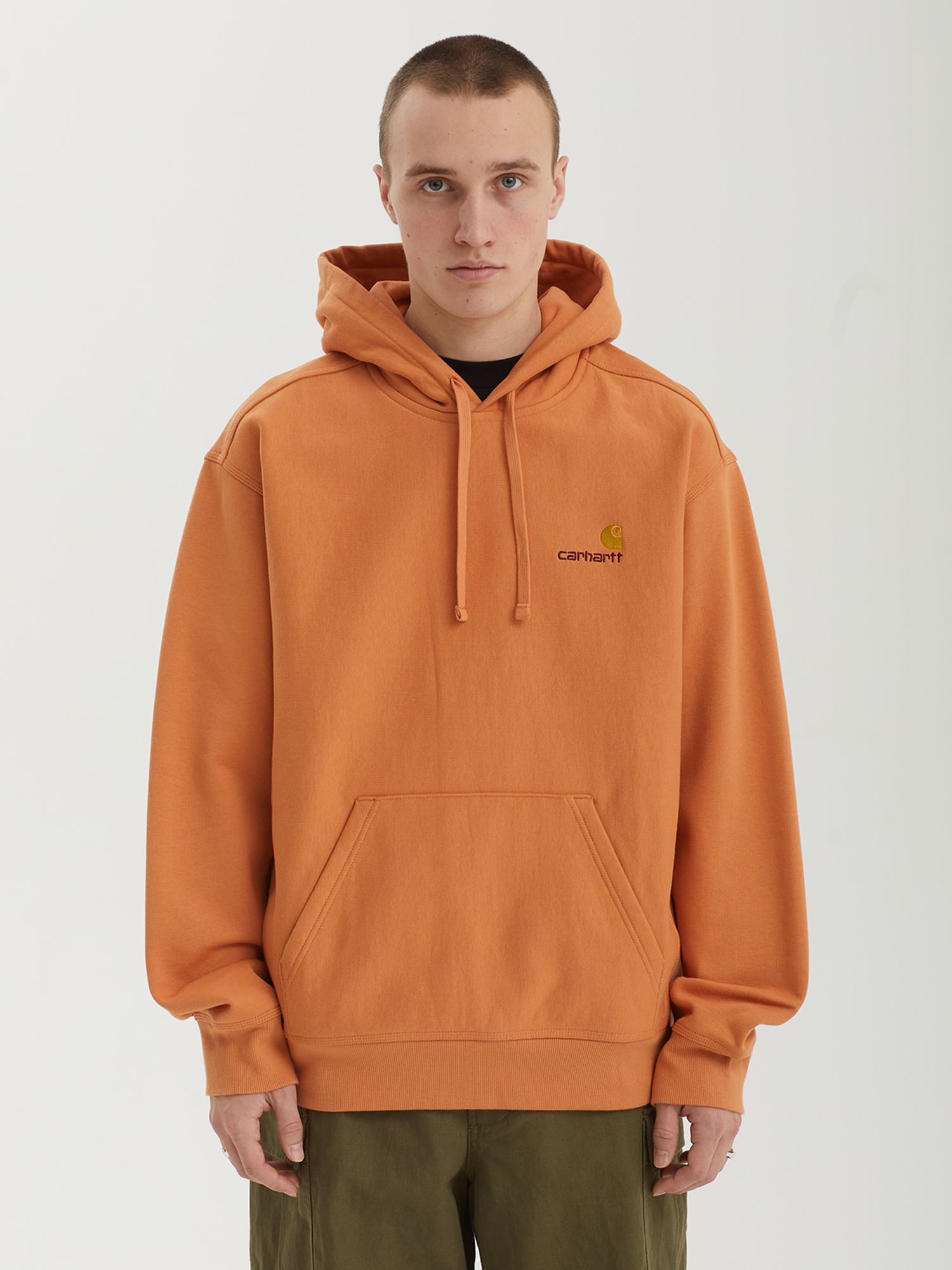 Толстовка Carhartt WIP выполнена из хлопкового футера с начесом и добавлением полиэстера. Капюшон на кулиске, традиционный накладной карман с двумя боковыми входами на животе. На груди — шрифтовая вышивка с логотипом. Низ и манжеты рукавов из трикотажной резинки.