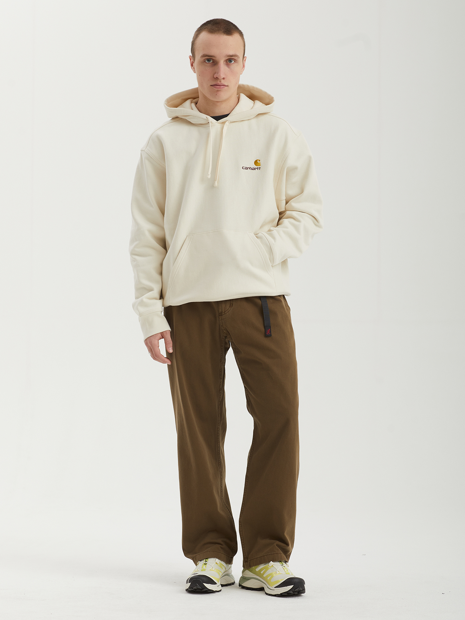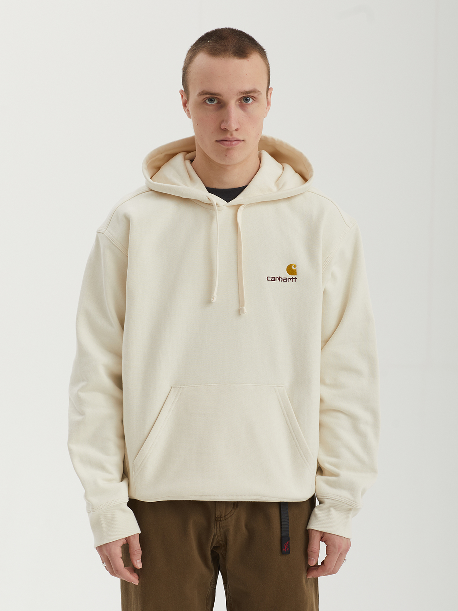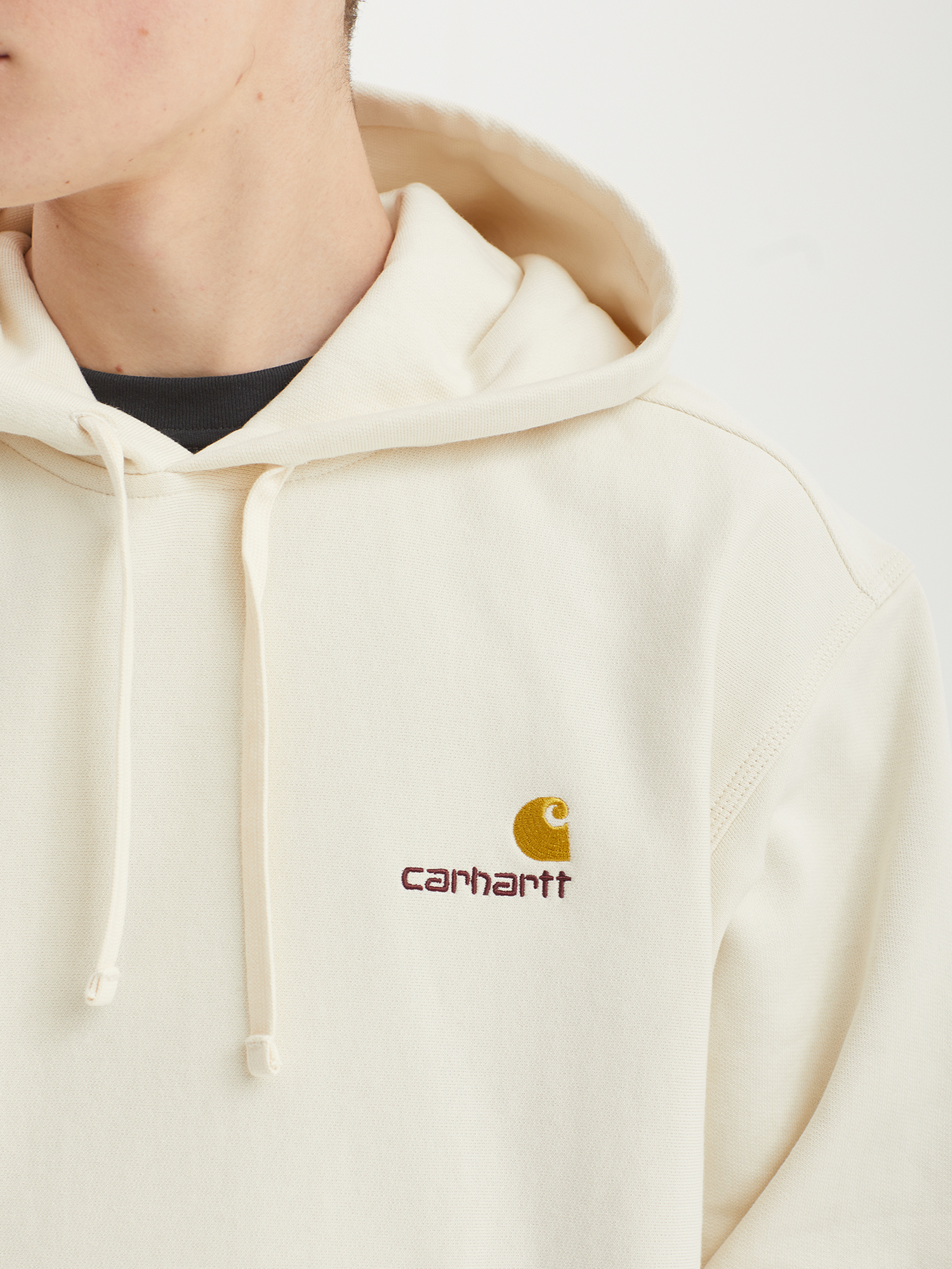 Толстовка Carhartt WIP выполнена из хлопкового футера с начесом и добавлением полиэстера. Капюшон на кулиске, традиционный накладной карман с двумя боковыми входами на животе. На груди — шрифтовая вышивка с логотипом. Низ и манжеты рукавов из трикотажной резинки.