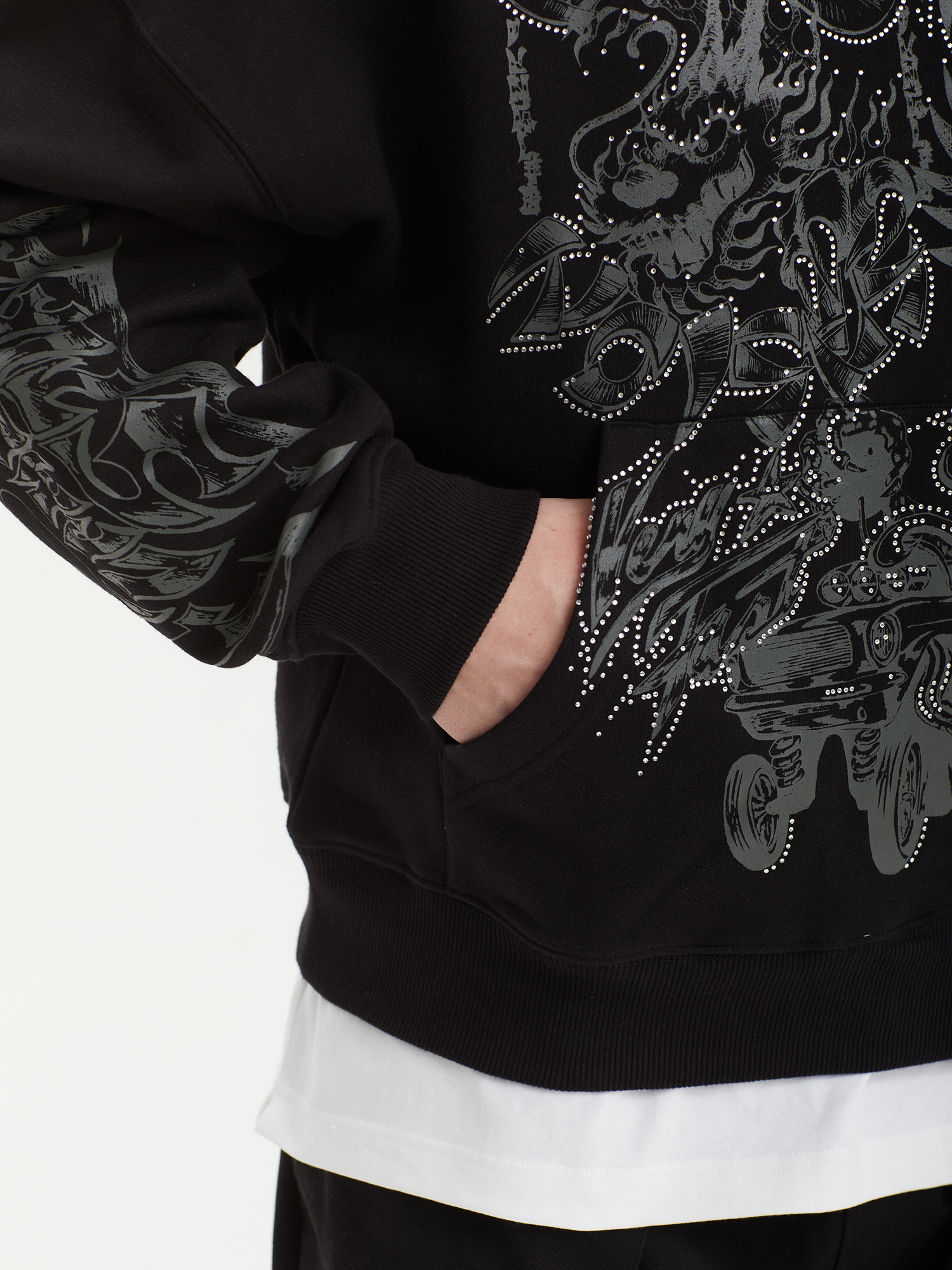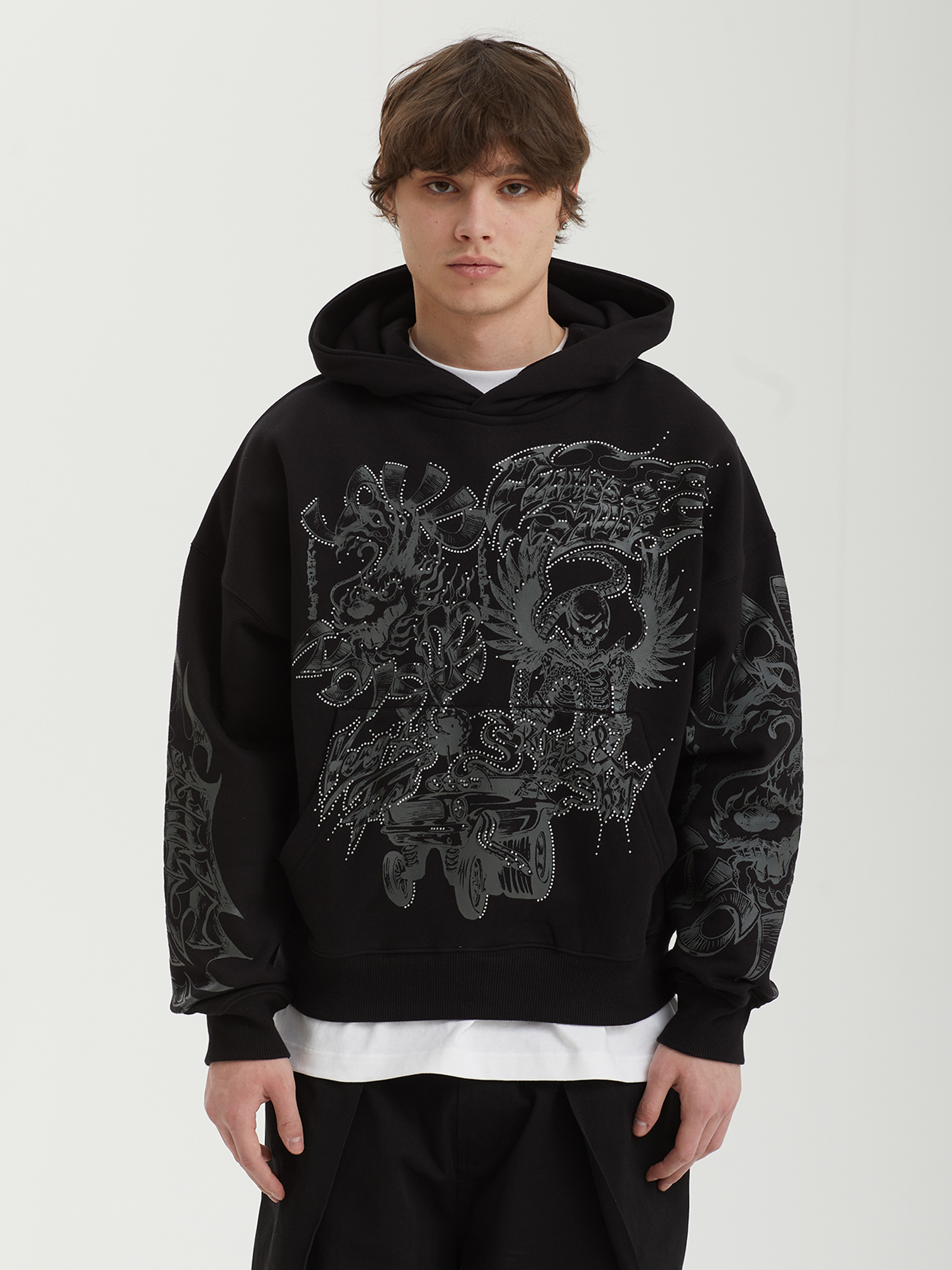 Худи Jungles Jungles из плотной ткани с ворсистой изнанкой. Изделие дополнено сезонными графическими принтами и аппликацией из страз. Бренд прошел сертификацию BSCI — инициативы по соблюдению социальных норм бизнеса.