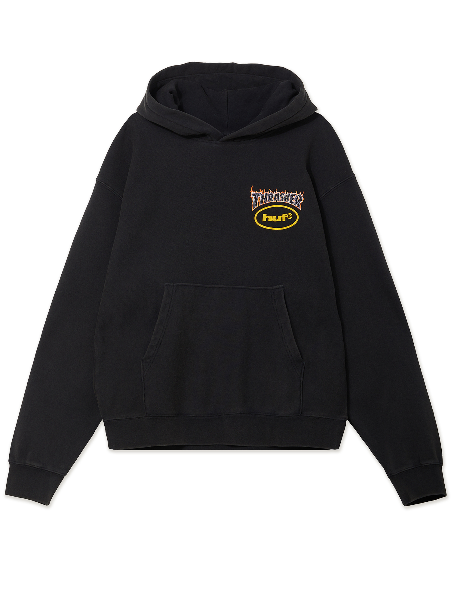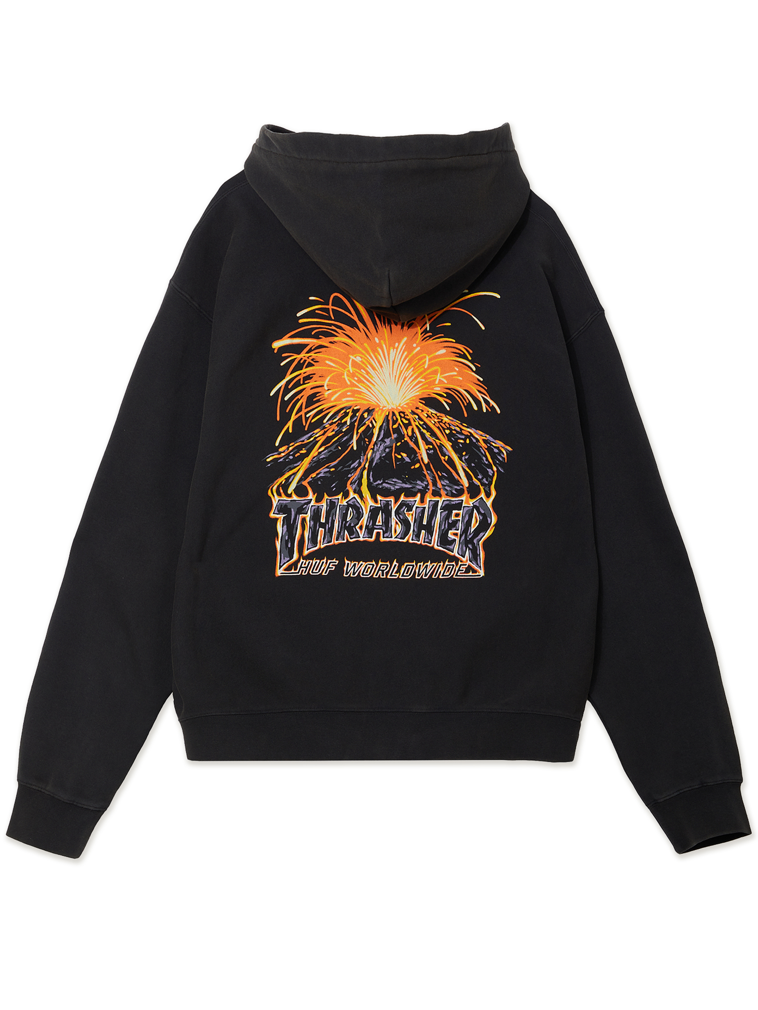 Худи Huf из коллаборации с Thrasher Mag. Изделие выполнено из плотного хлопкового материала с ворсистой изнанкой и дополнено двойным брендингом.