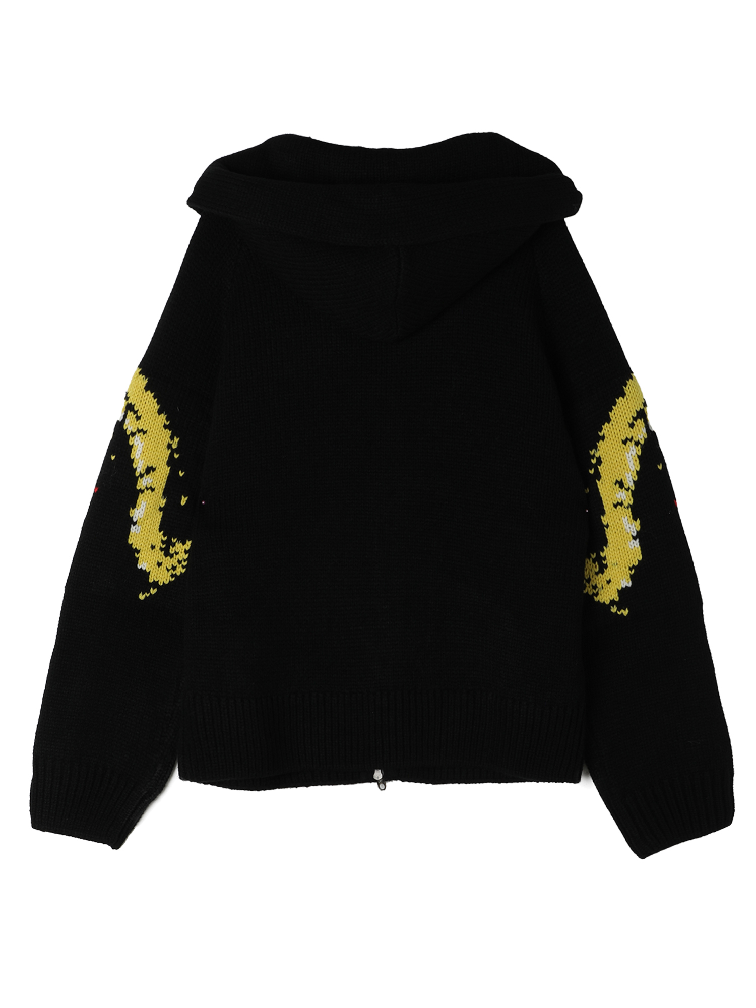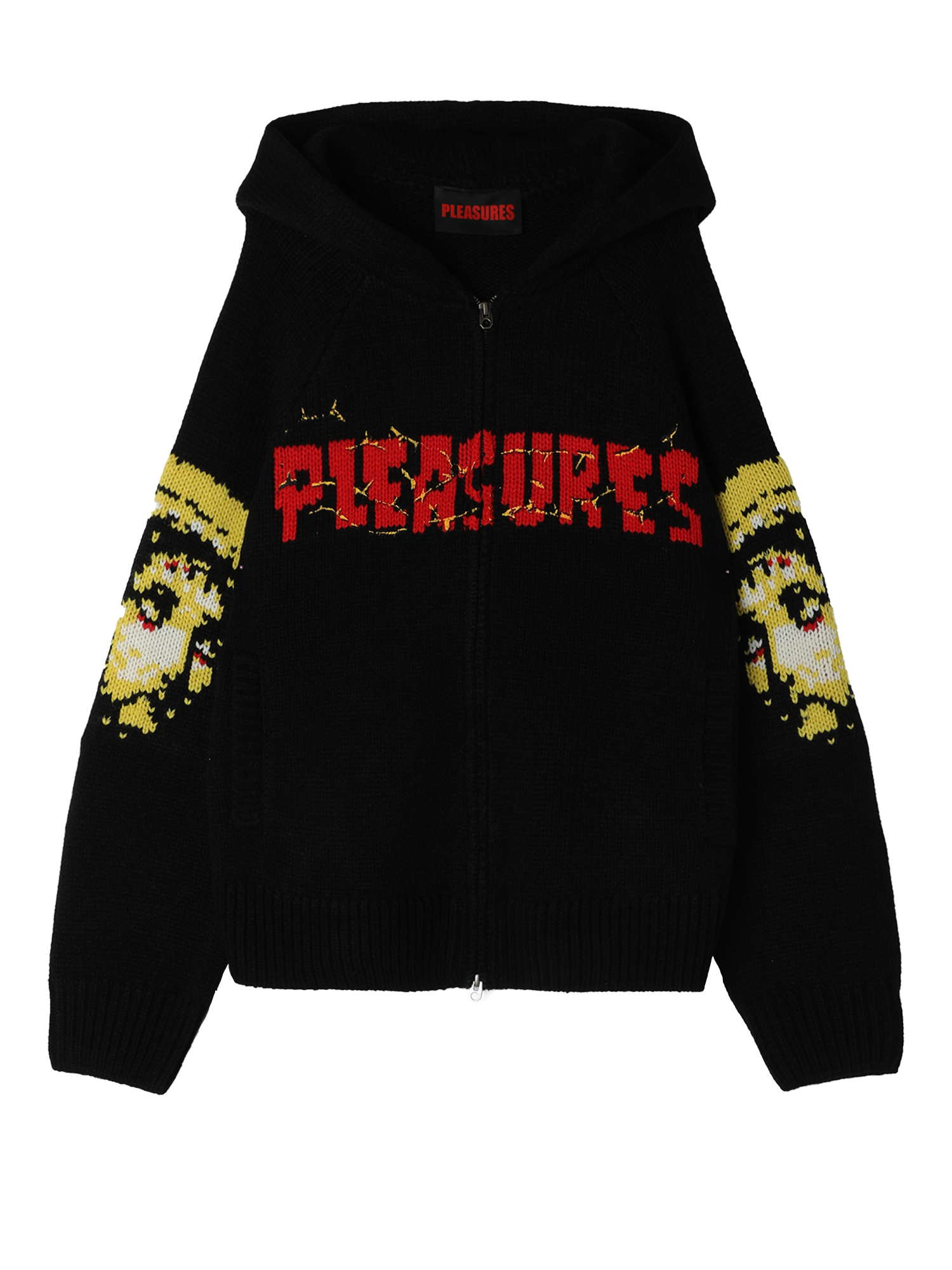 Худи на молнии Pleasures из смесовой пряжи с добавлением натуральной шерсти. Яркий рисунок выполнен в технике двусторонней вязки цветовыми блоками.