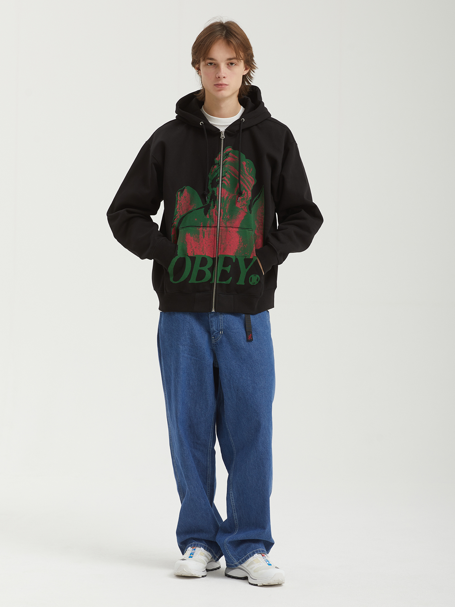 Худи на молнии Obey из плотного смесового материала с ворсистой изнанкой. Изделие дополнено сезонным принтом принтом с логотипом бренда.