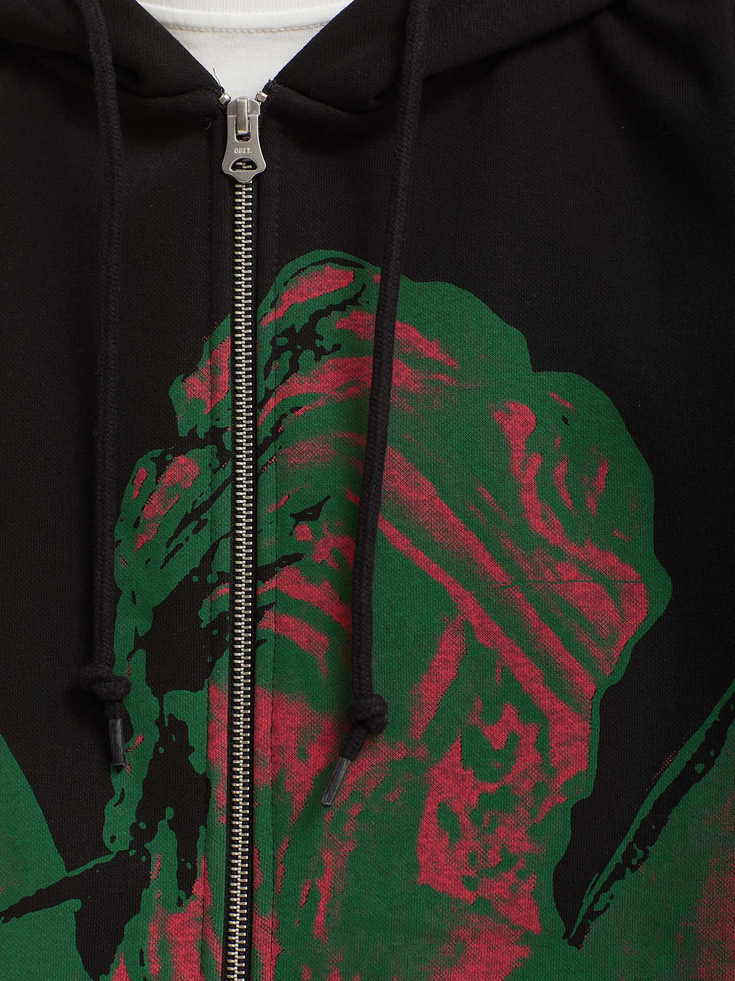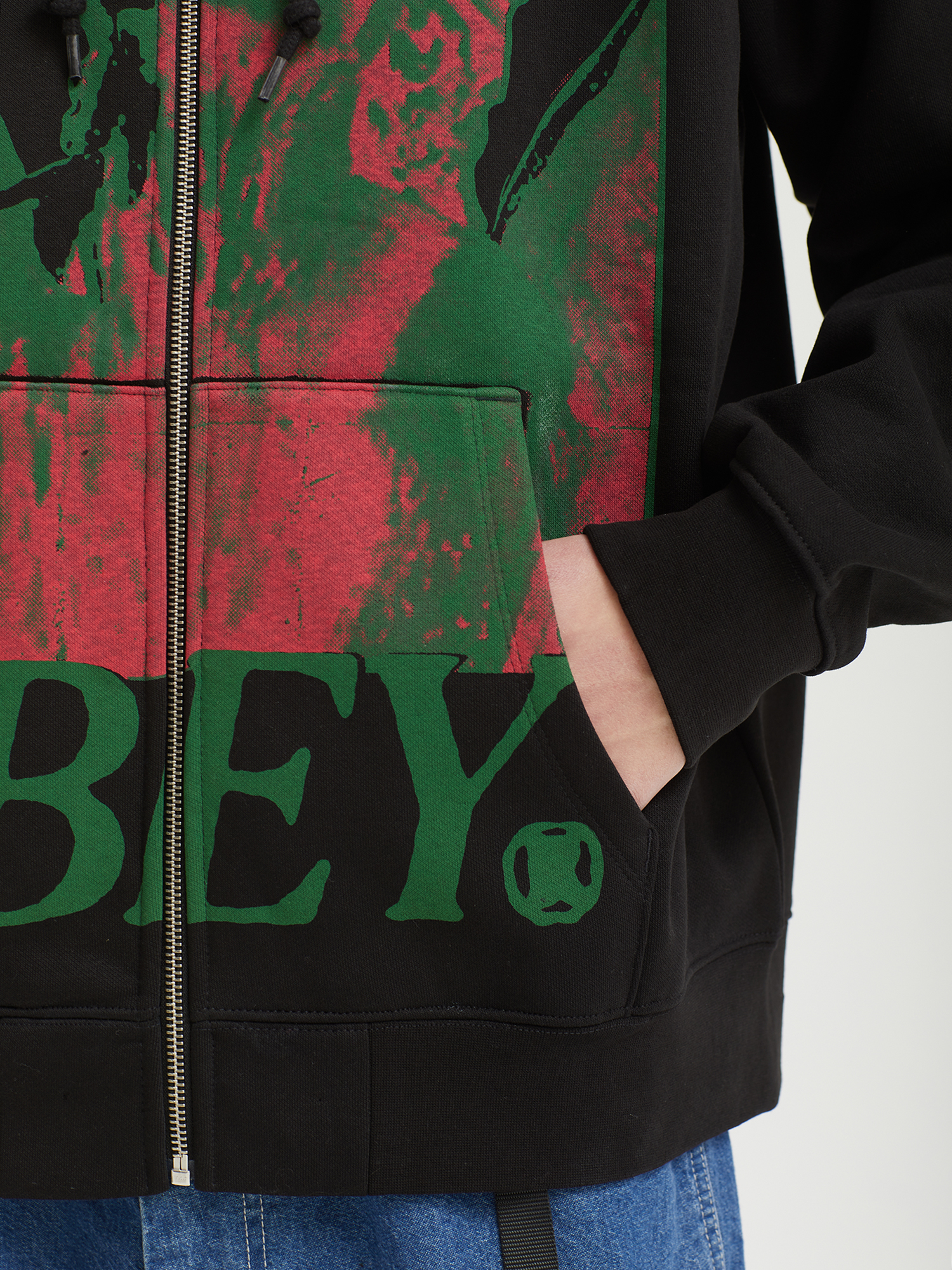 Худи на молнии Obey из плотного смесового материала с ворсистой изнанкой. Изделие дополнено сезонным принтом принтом с логотипом бренда.