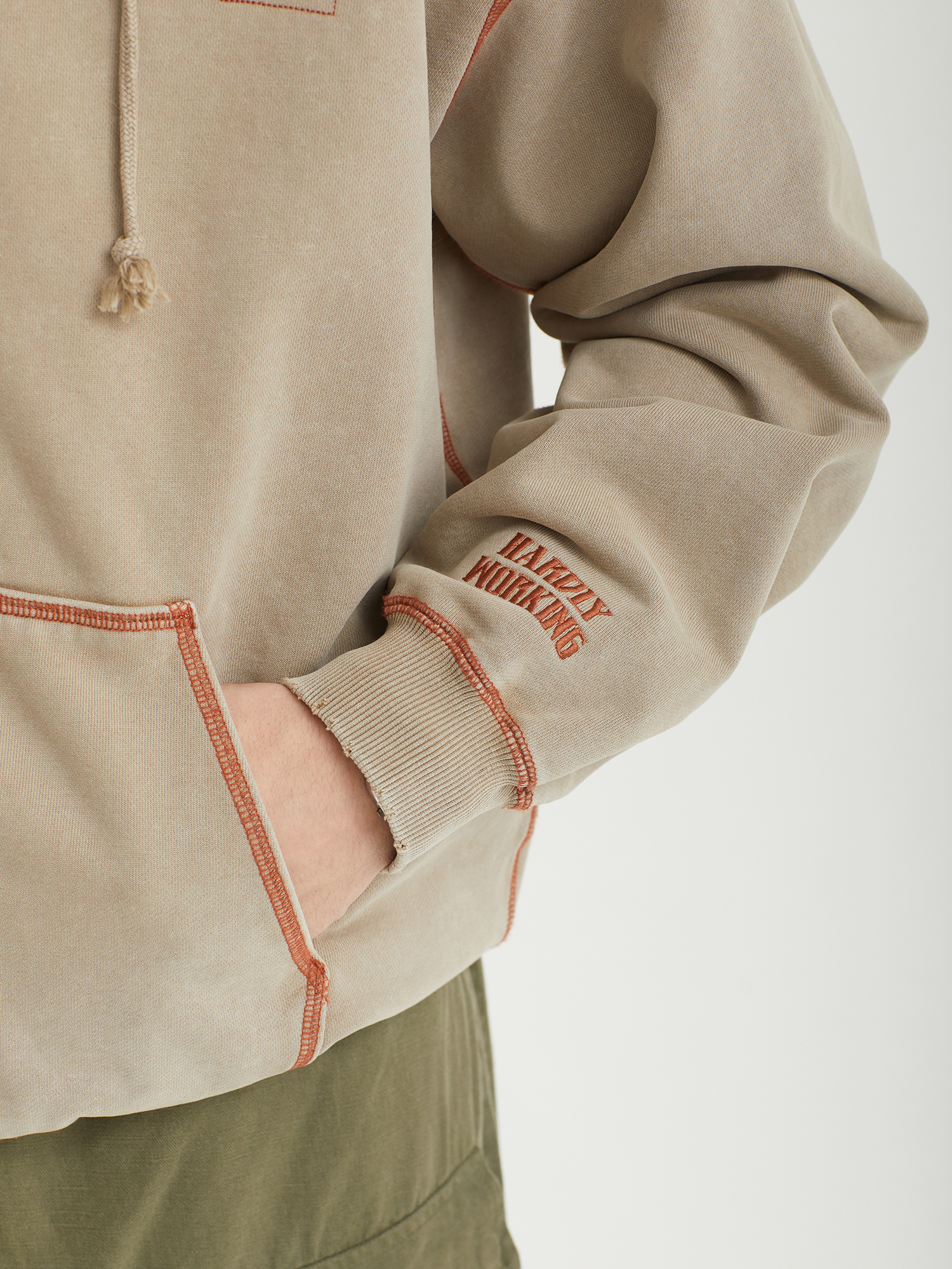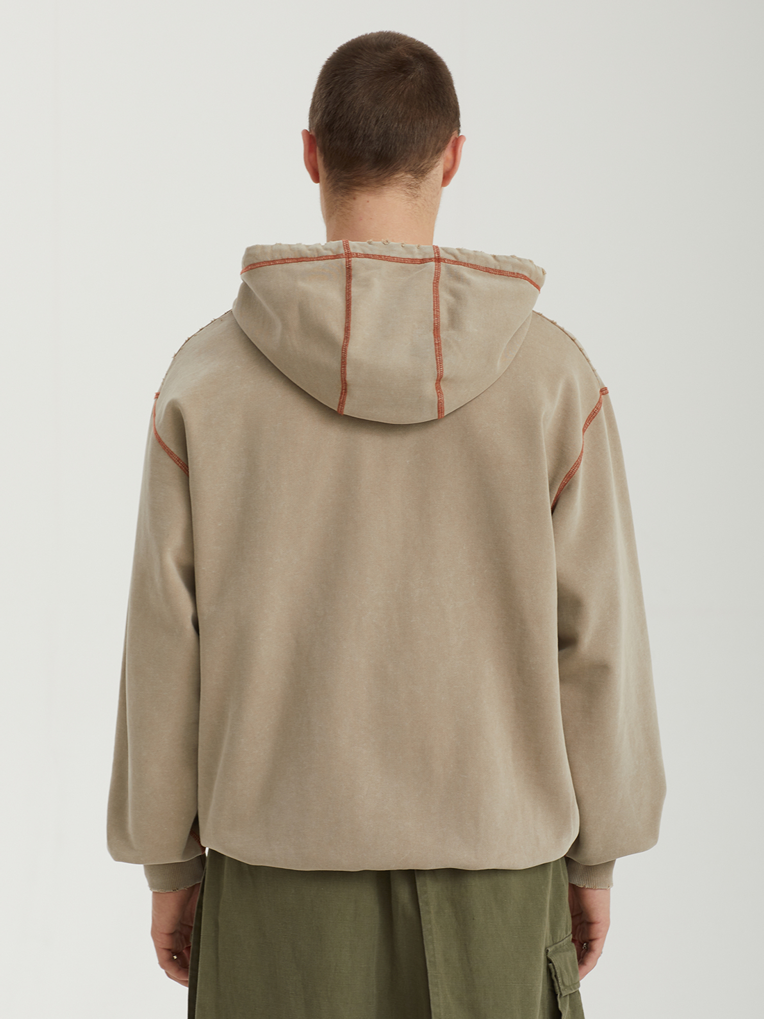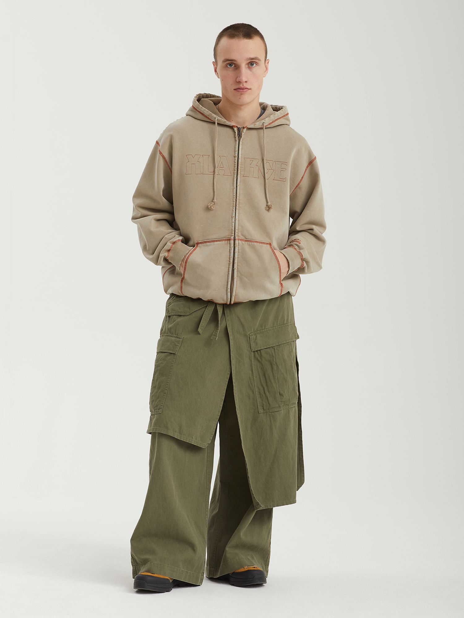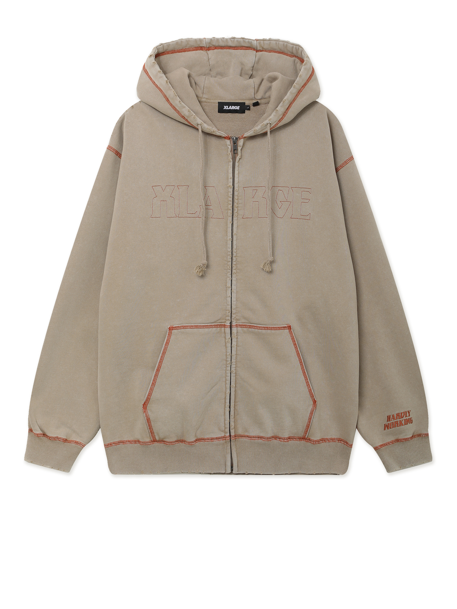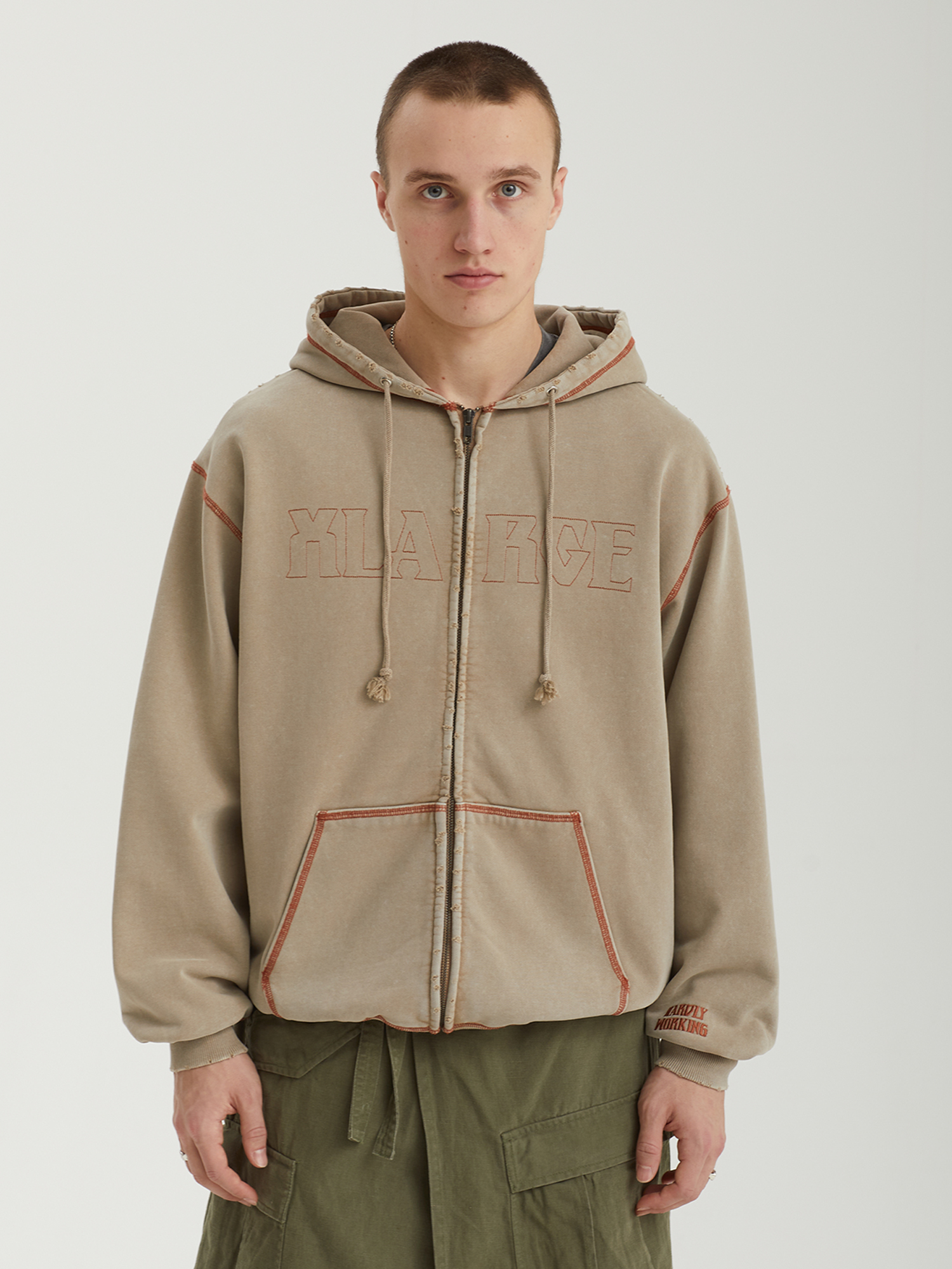Толстовка XLarge выполнена из плотного хлопкового футера с петельчатой изнанкой и декорирована контрастной строчкой. Изделие прошло специальную обработку в готовом виде и отличается выраженным винтажным эффектом, включая акцентные прорези по краям. Вышивки на фронтальной части и рукаве дополняют дизайн.
