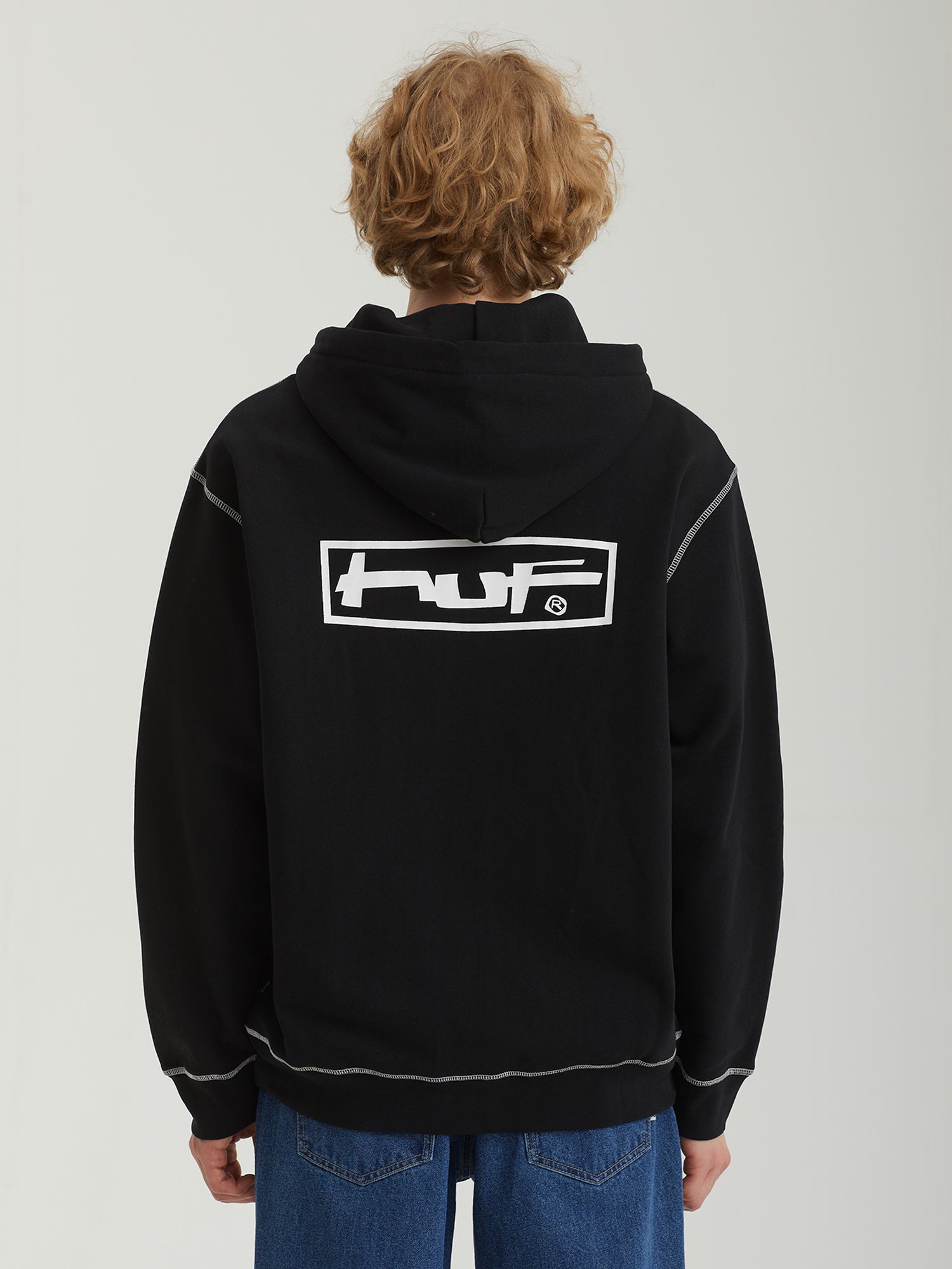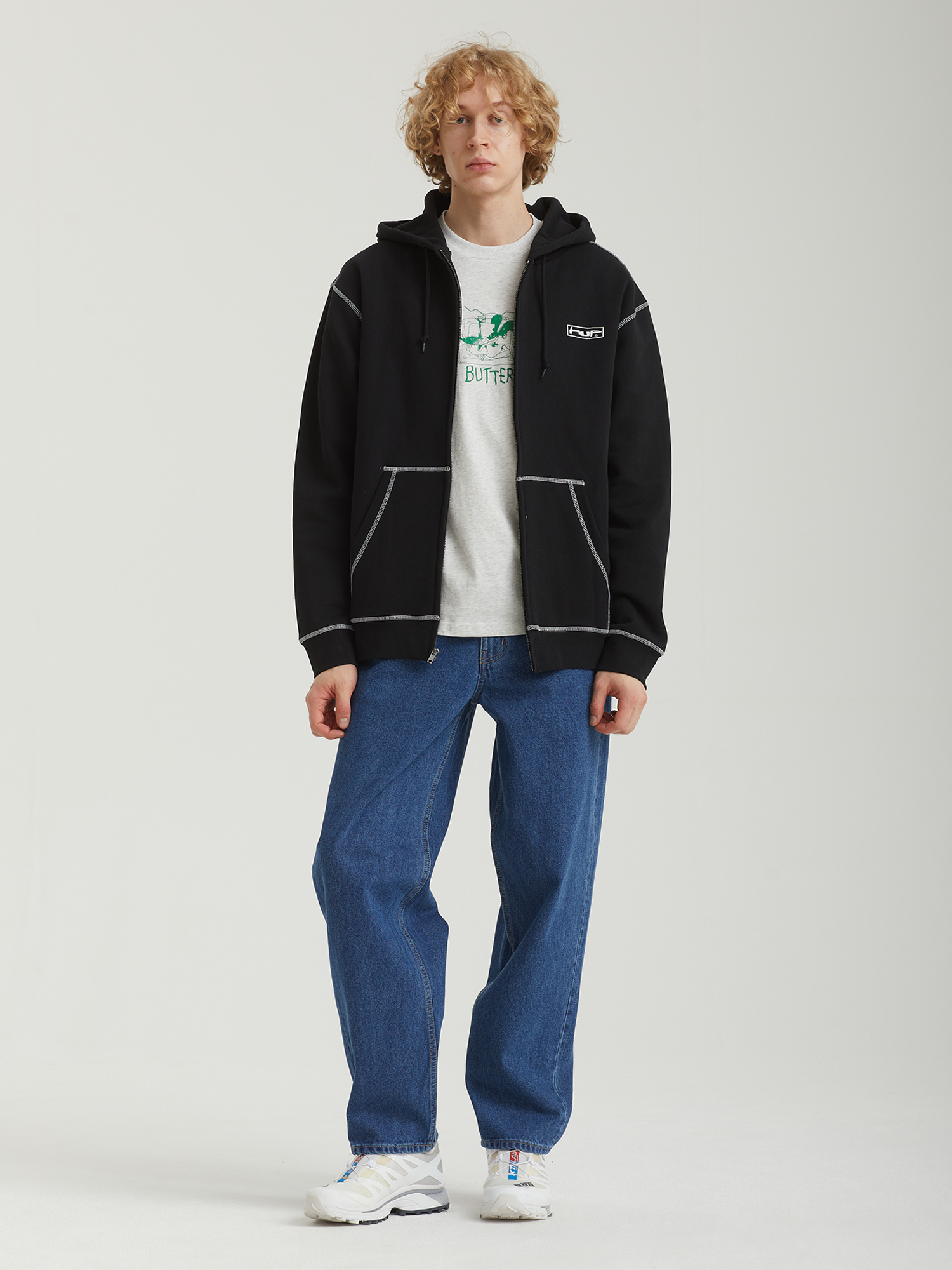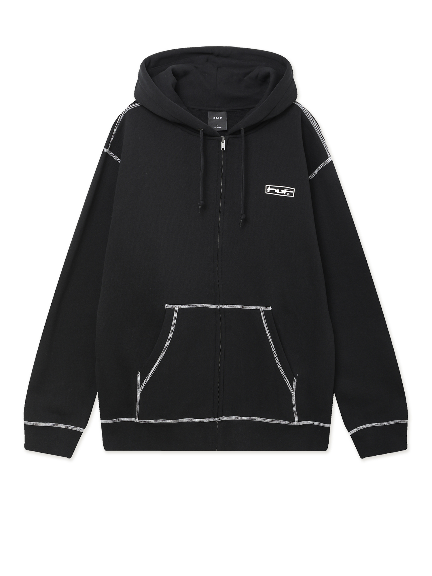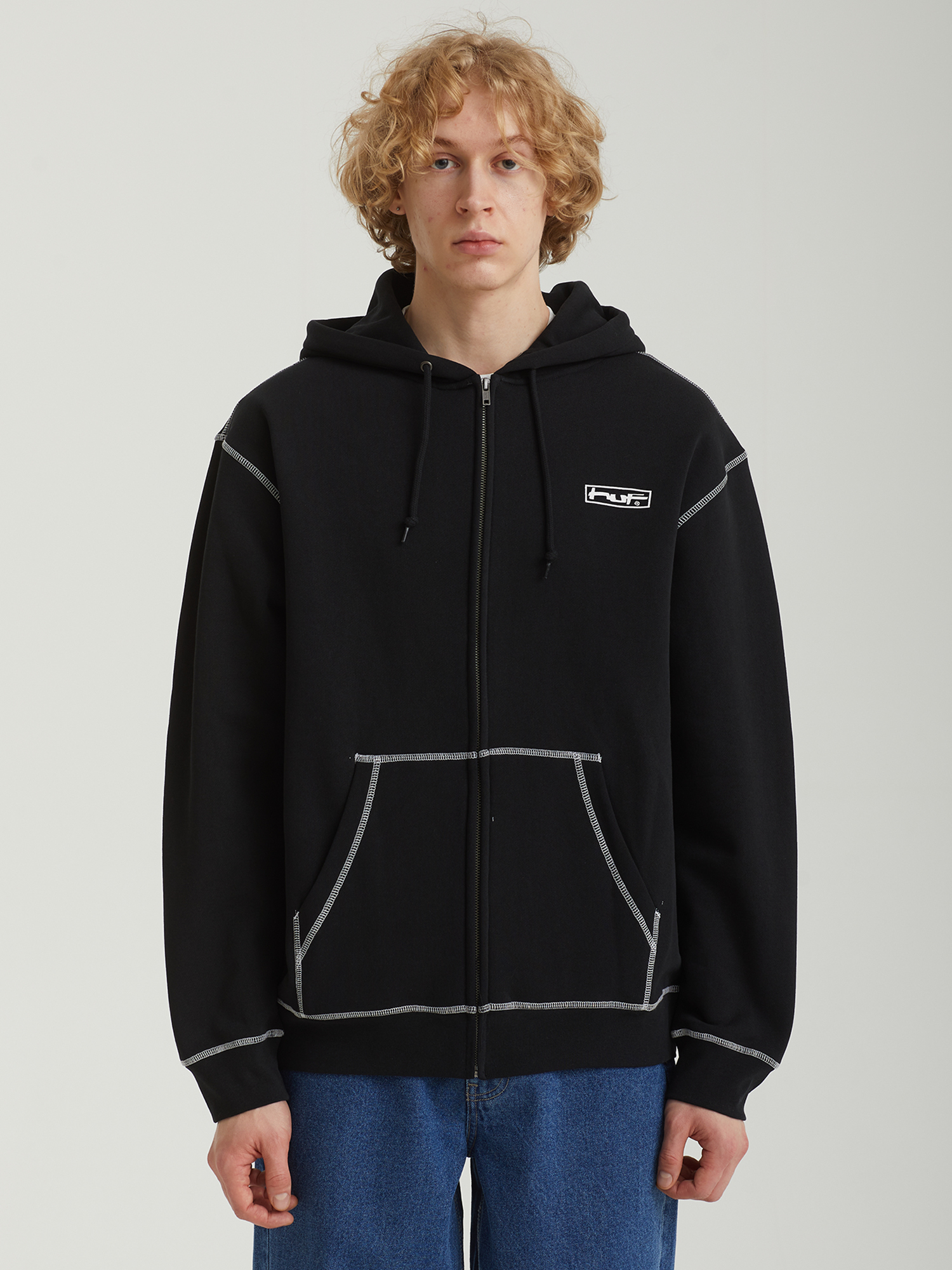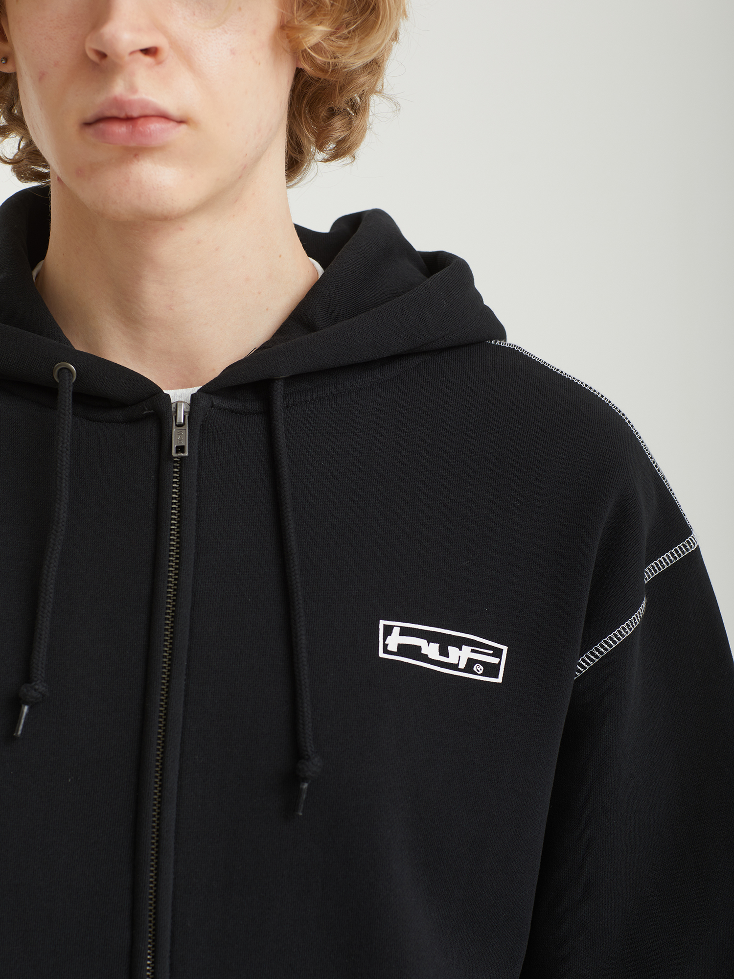 Худи на молнии Huf из плотного смесового материала с ворсистой изнанкой. Изделие дополнено контрастными принтами и строчкой оверлок.