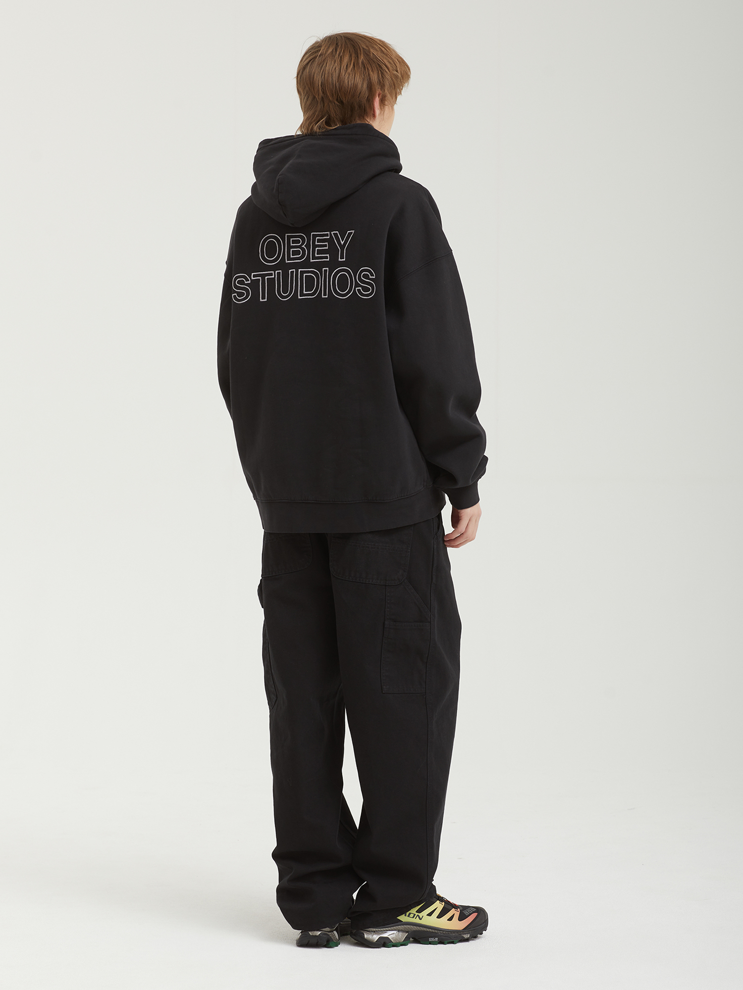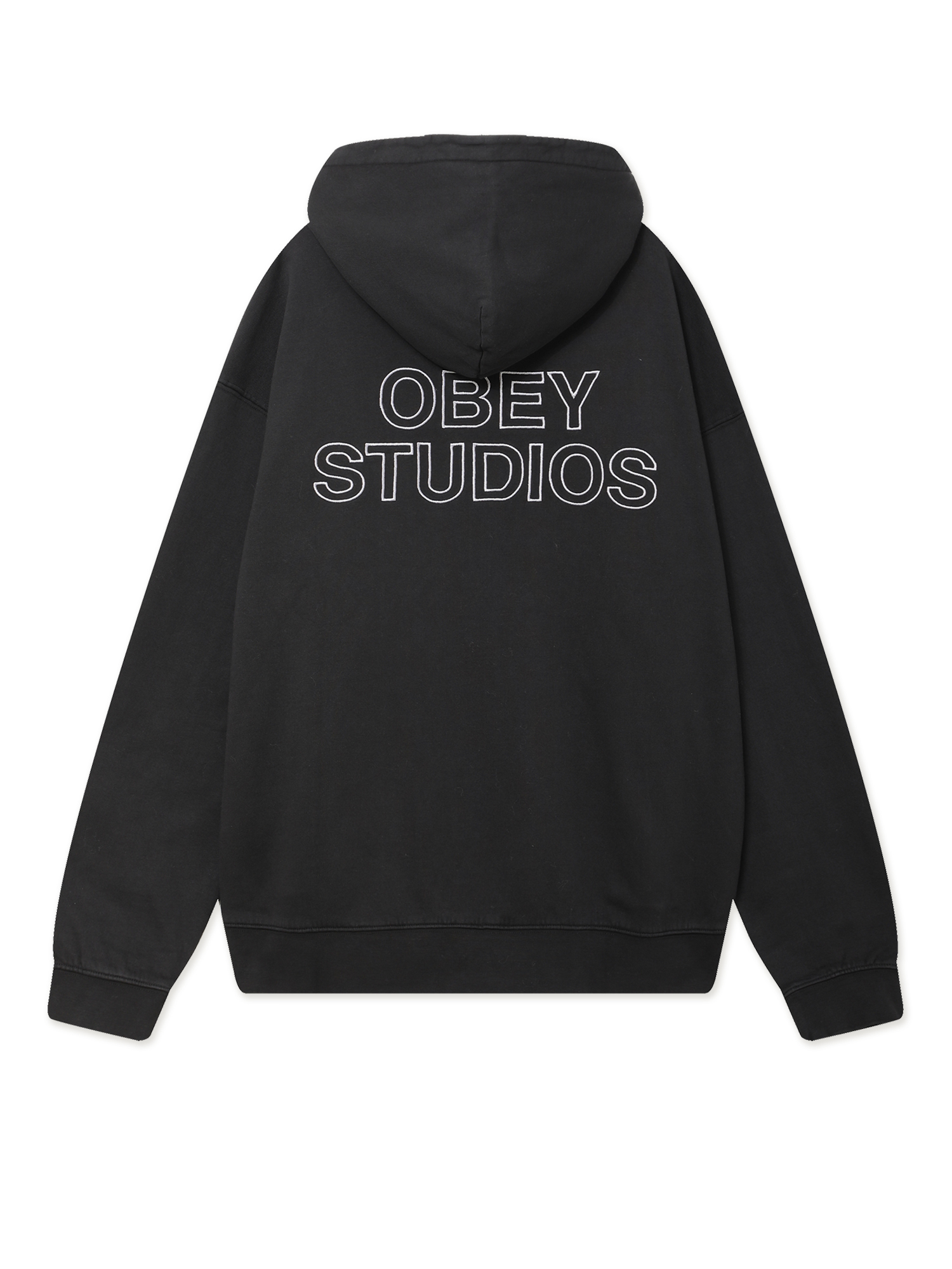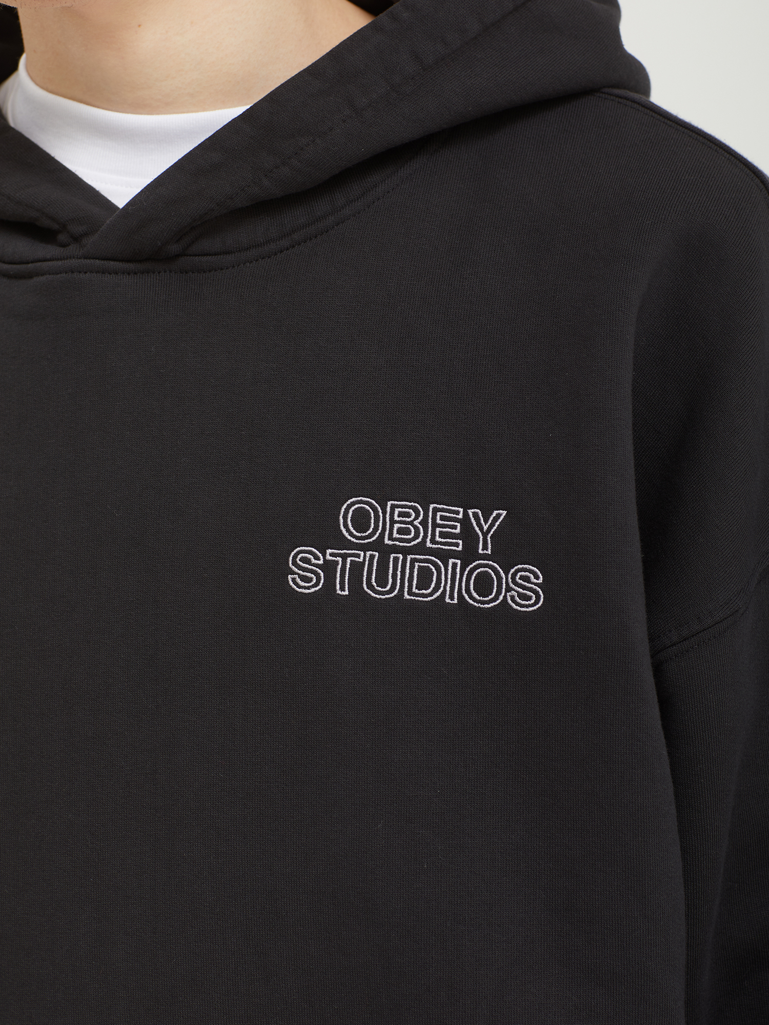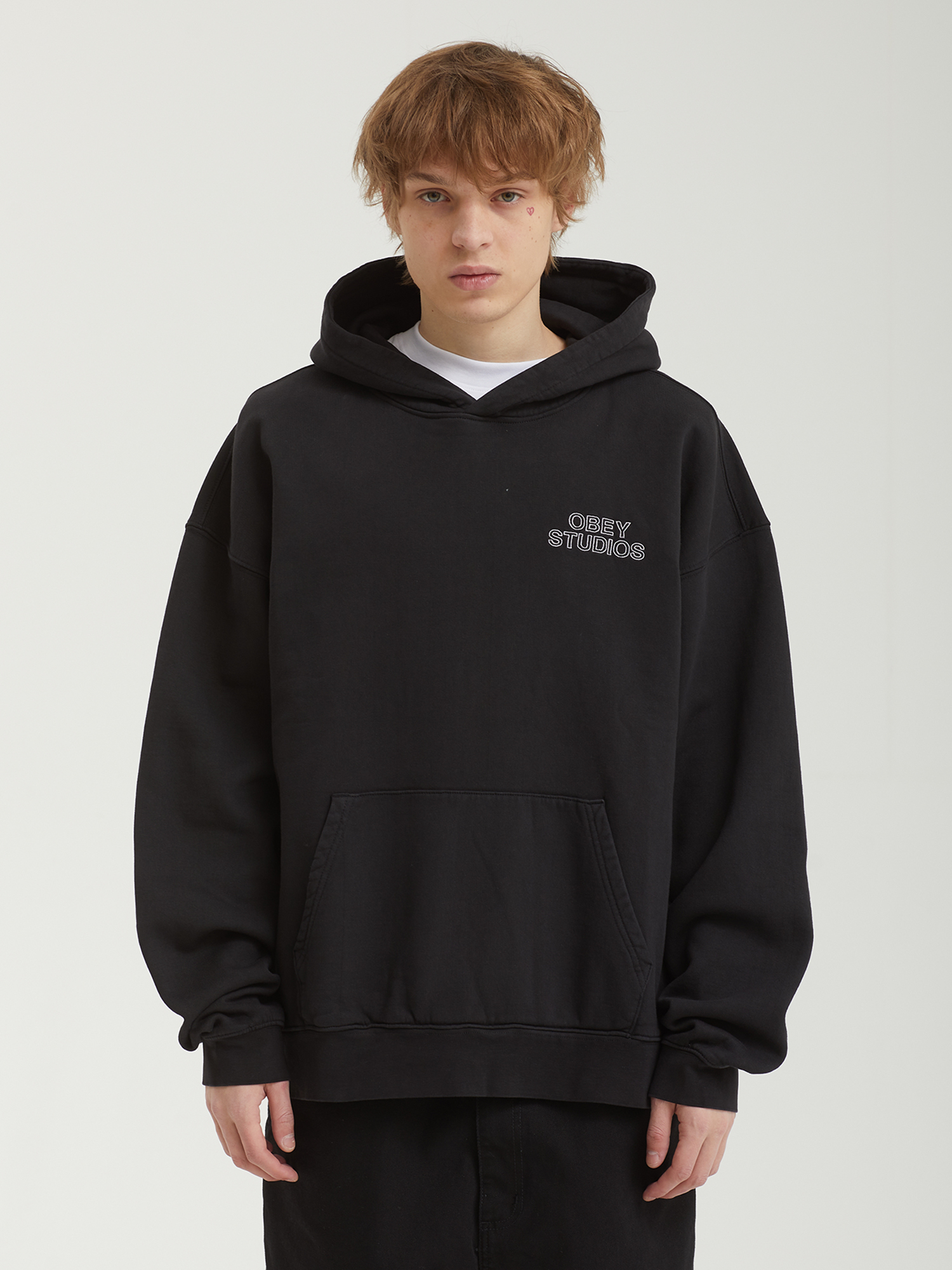 Худи Obey из плотного хлопкового материала с ворсистой изнанкой. Модель имеет свободный boxy fit — широкий и слегка укороченный силуэт со спущенной линией плеч. Благодаря специальной обработке (faded wash) изделие выделяется эффектом винтажности. Толстовка оснащена объёмным карманом-кенгуру, эластичными манжетами и нижней резинкой в рубчик для лучшей посадки, а вышивки на груди и спине отражают узнаваемый стиль бренда.