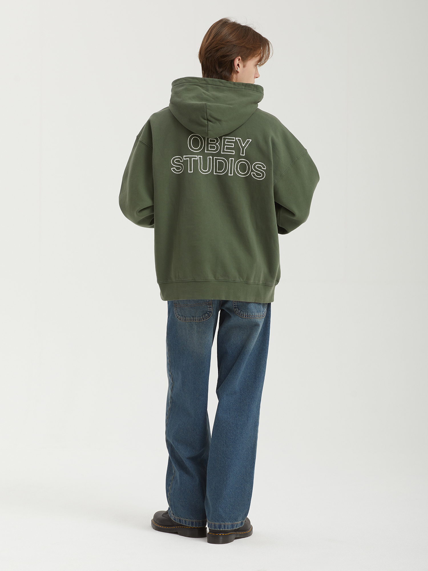 Худи Obey из плотного хлопкового материала с ворсистой изнанкой. Модель имеет свободный boxy fit — широкий и слегка укороченный силуэт со спущенной линией плеч. Благодаря специальной обработке (faded wash) изделие выделяется эффектом винтажности. Толстовка оснащена объёмным карманом-кенгуру, эластичными манжетами и нижней резинкой в рубчик для лучшей посадки, а вышивки на груди и спине отражают узнаваемый стиль бренда.