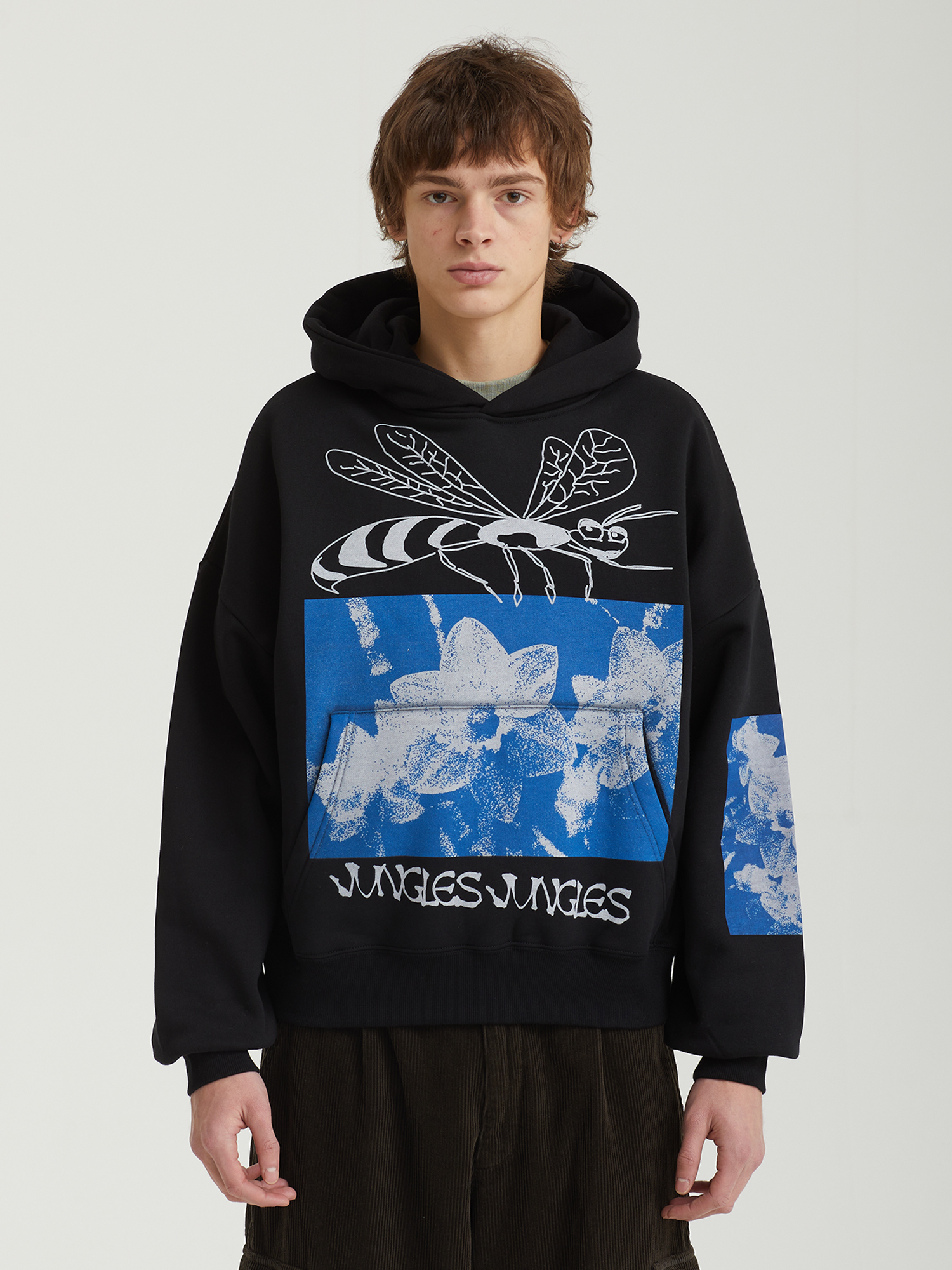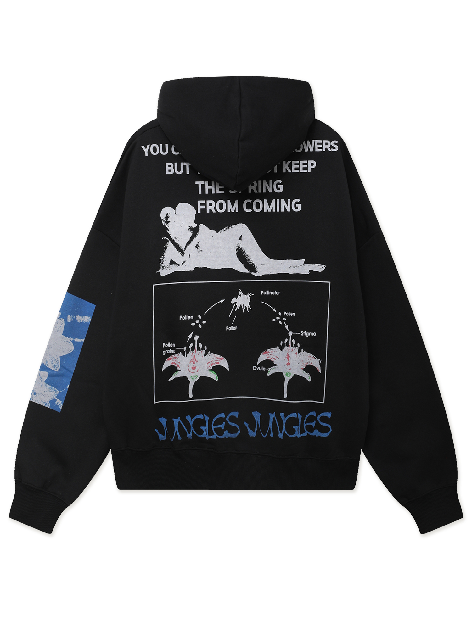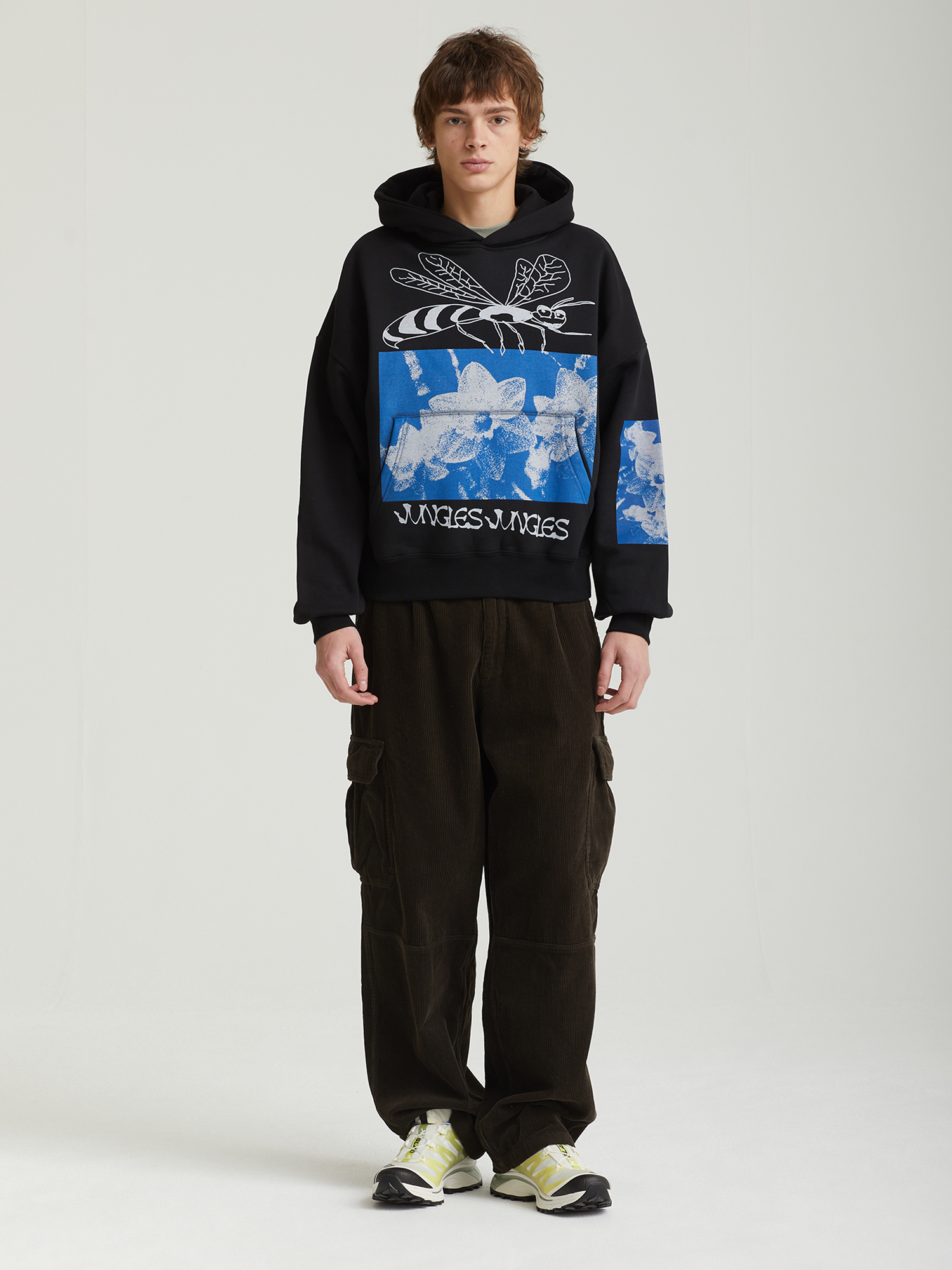 Худи Jungles Jungles из плотной ткани с ворсистой изнанкой. Изделие дополнено принтами, посвященными творчеству чиллийского поэта Пабло Неруда. Бренд прошел сертификацию BSCI — инициативы по соблюдению социальных норм бизнеса.