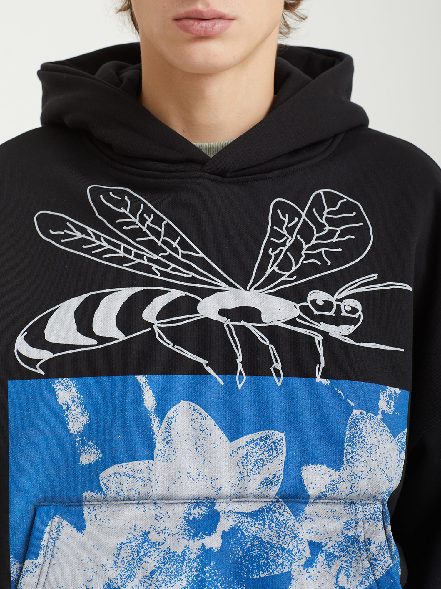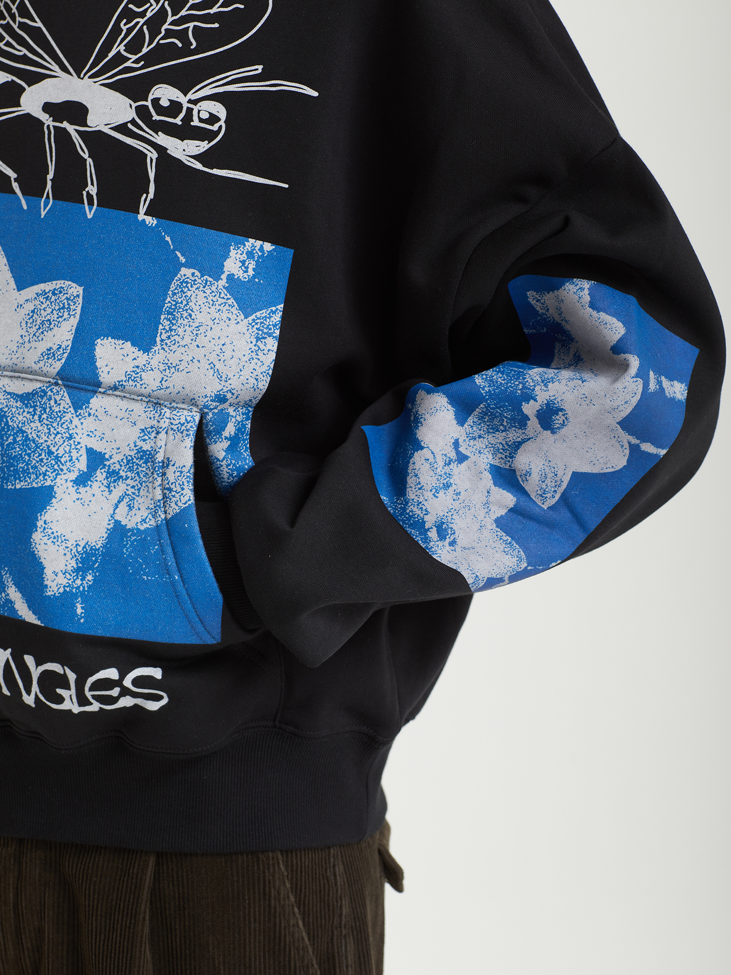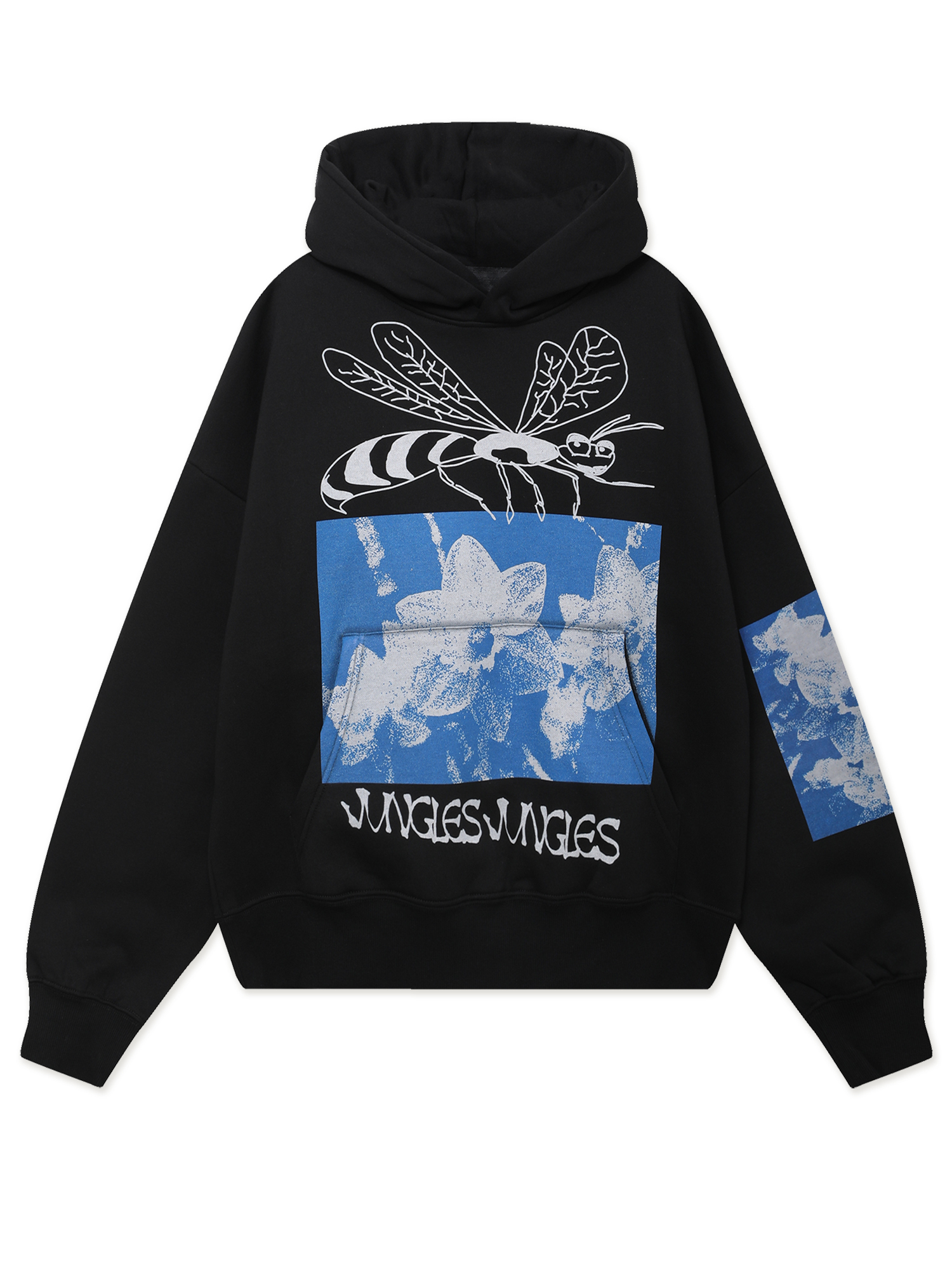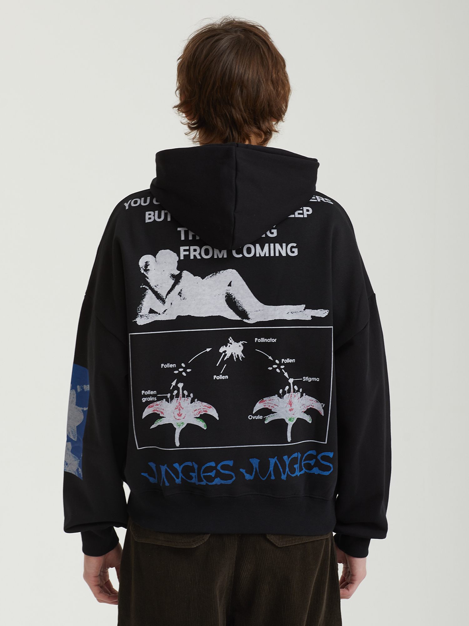 Худи Jungles Jungles из плотной ткани с ворсистой изнанкой. Изделие дополнено принтами, посвященными творчеству чиллийского поэта Пабло Неруда. Бренд прошел сертификацию BSCI — инициативы по соблюдению социальных норм бизнеса.